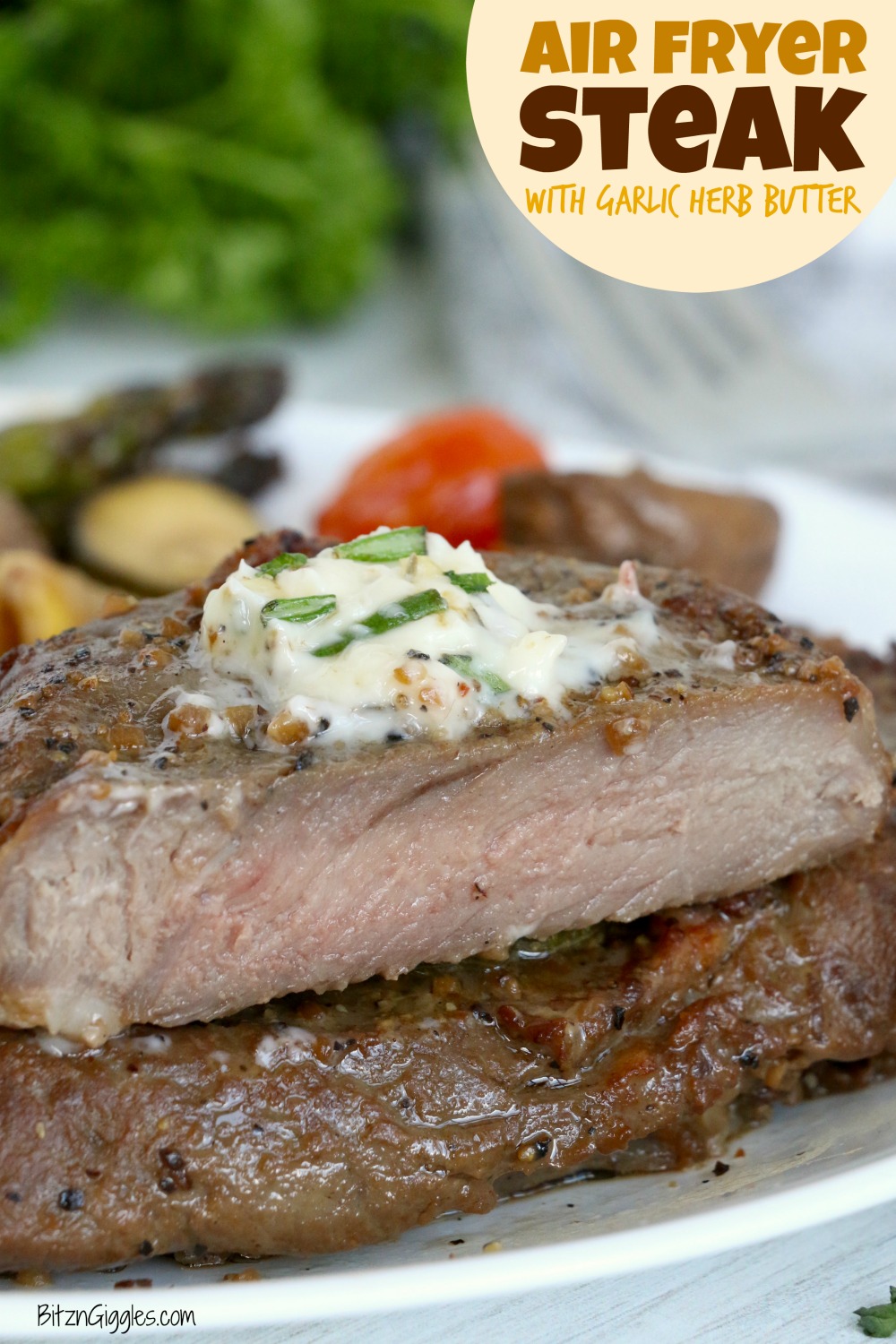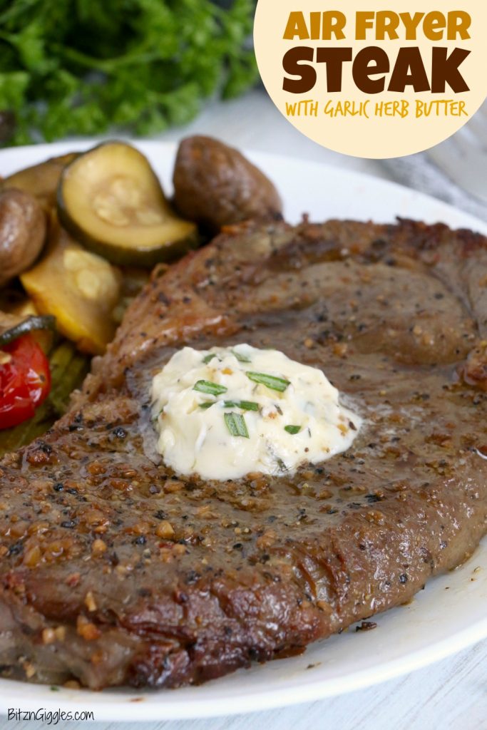 Air Fryer Steak - Ribeye steaks immersed in a three-ingredient marinade, air fried to perfection and topped with flavorful homemade garlic herb butter.
