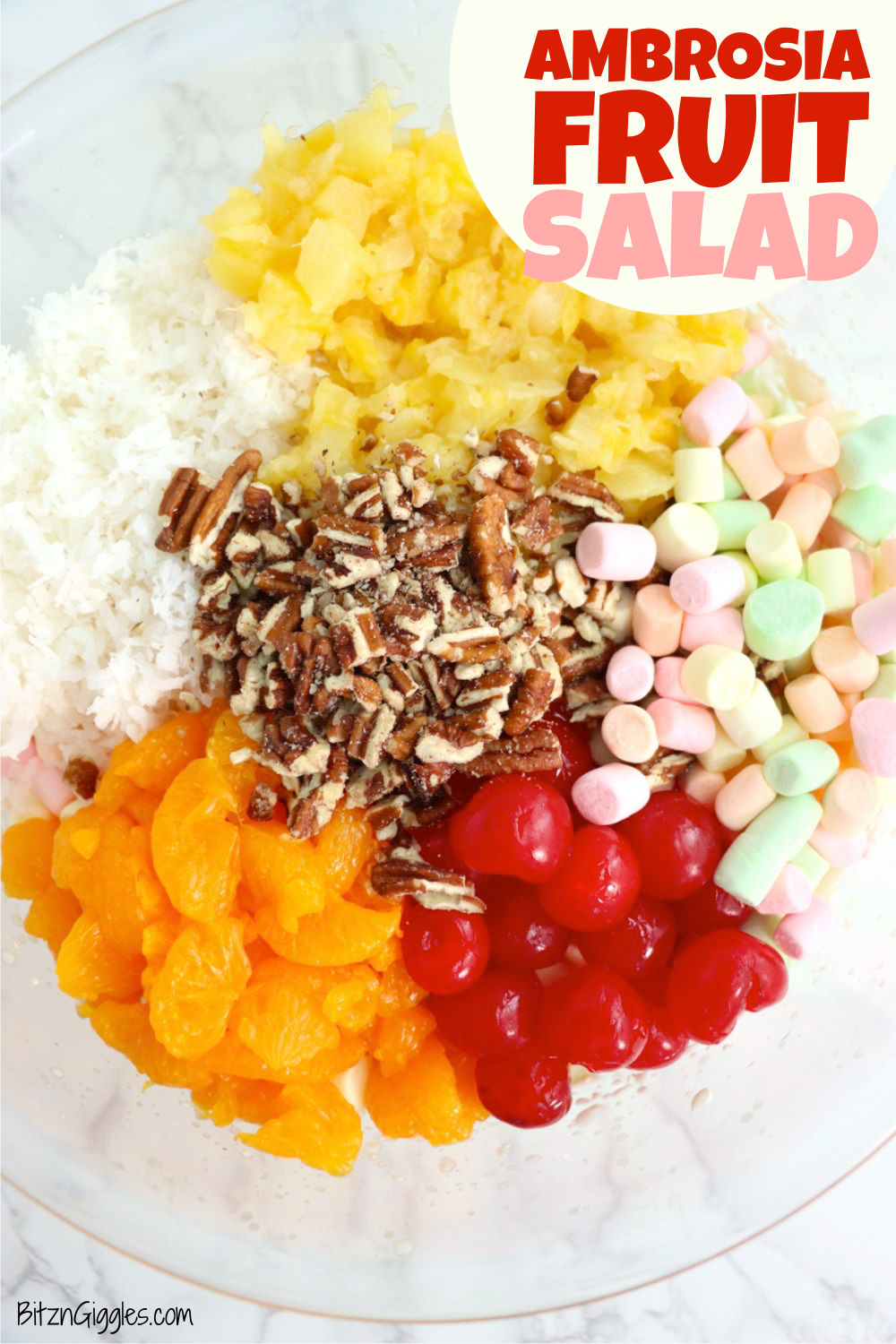 Ambrosia Fruit Salad - A classic fruit salad made with fresh pineapples, juicy mandarin oranges, maraschino cherries, mini marshmallows, coconut and delicious whipped cream. It's the perfect springtime side dish!