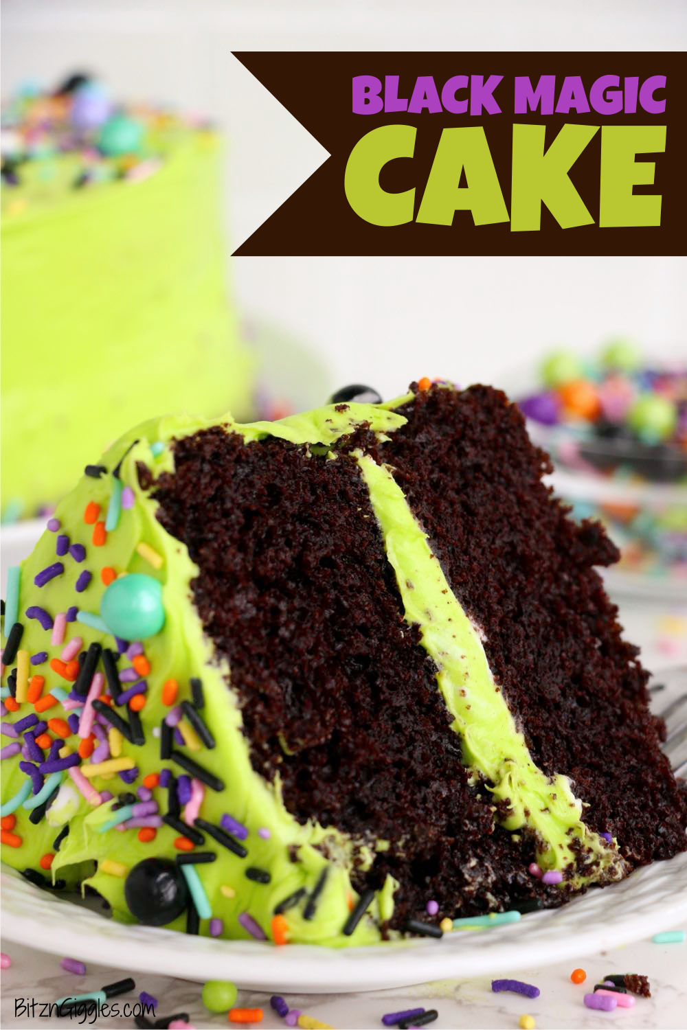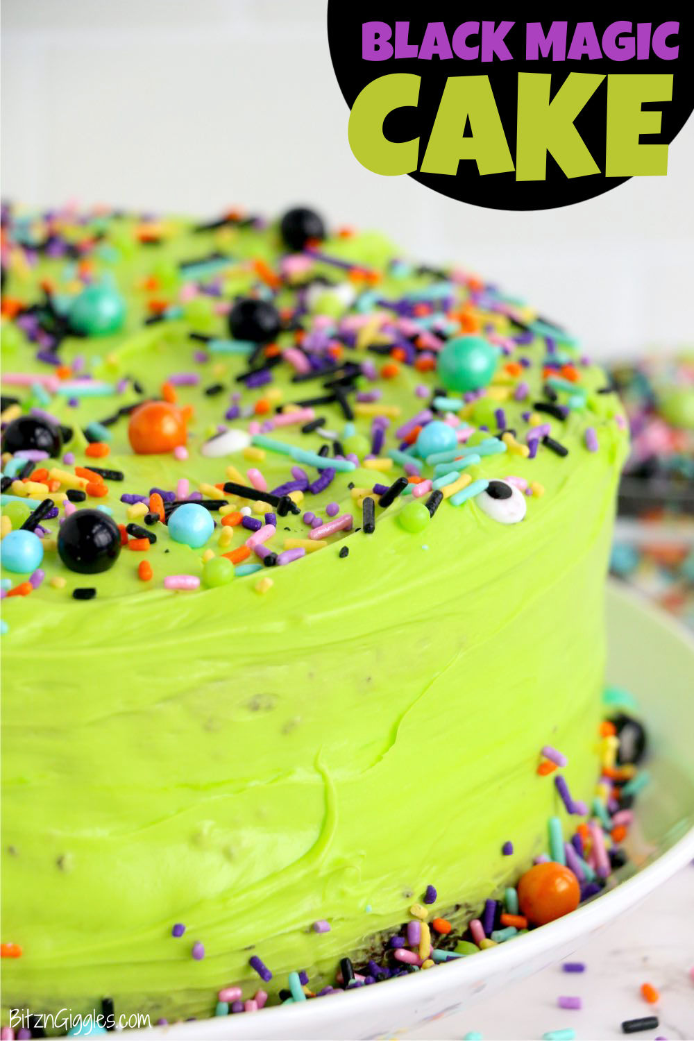 Black Magic Cake - A spooky homemade chocolate cake with witchy green buttercream frosting and Halloween-themed sprinkles.