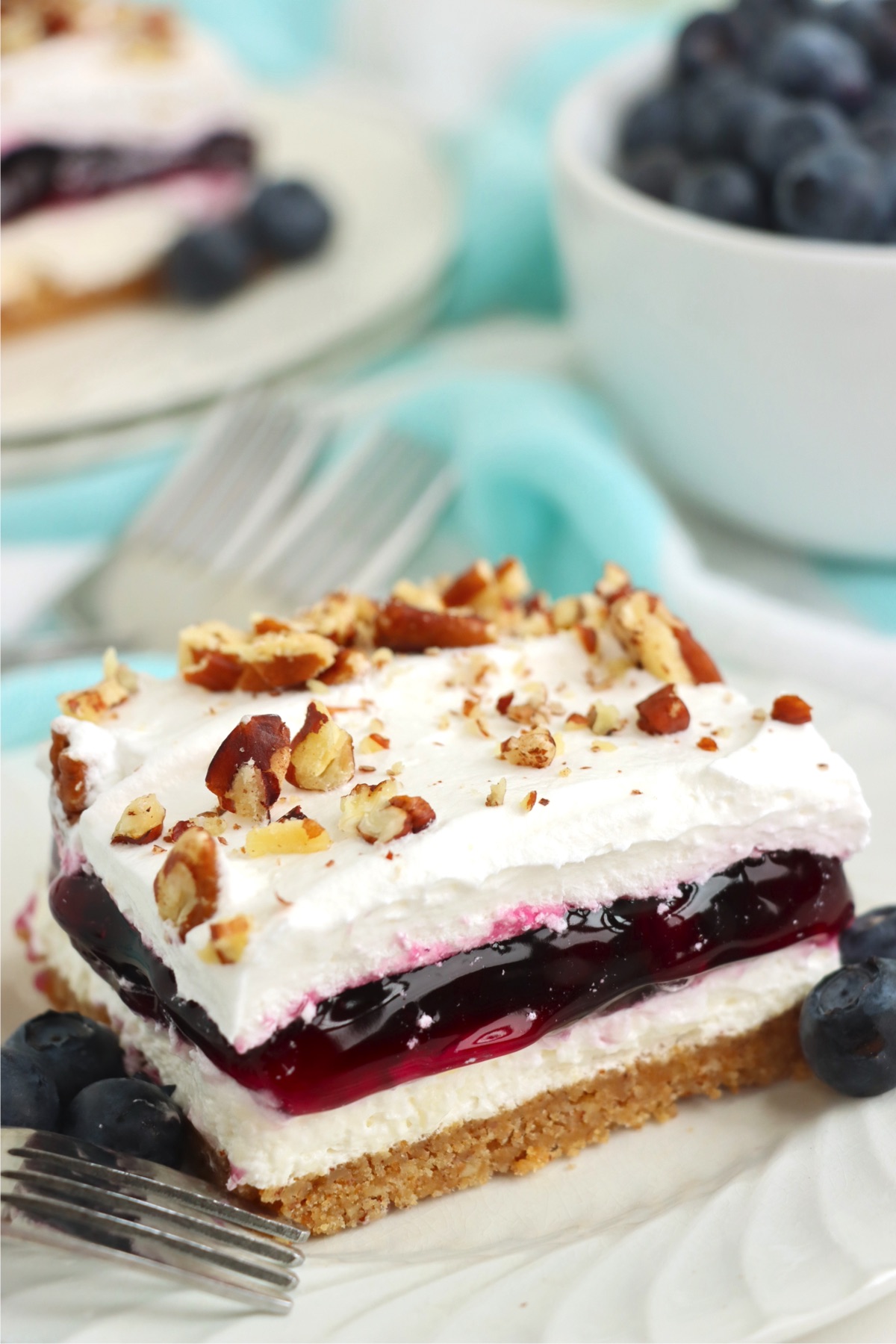 Also known as a blueberry delight, this layered dessert definitely is delightful! With sweet blueberry flavor, a creamy cheesecake filling, fluffy whipped topping, and a golden graham cracker and pecan crust, you simply cannot go wrong with this dreamy recipe!