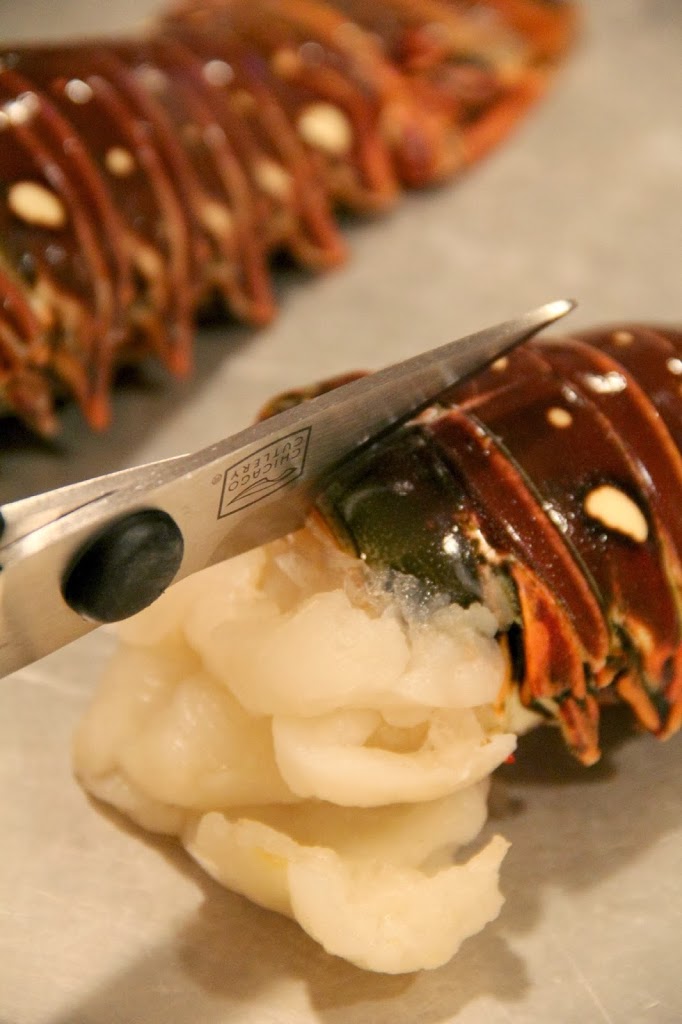 - Start by cutting the shell of the lobster tail right down the middle with a clean kitchen shears. Try not to cut into the meat. Cut above the meat so you're cutting the shell only.