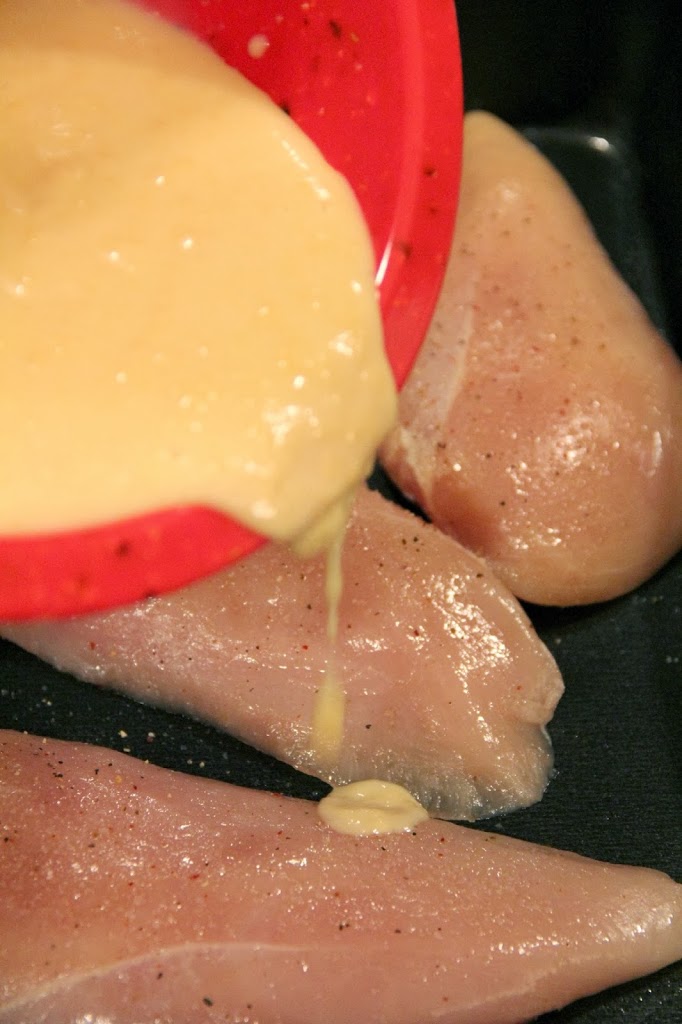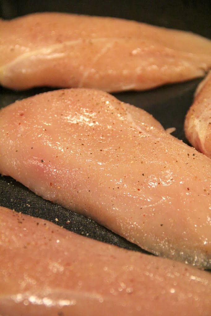 - Grease and place chicken in a casserole dish – season with salt and pepper