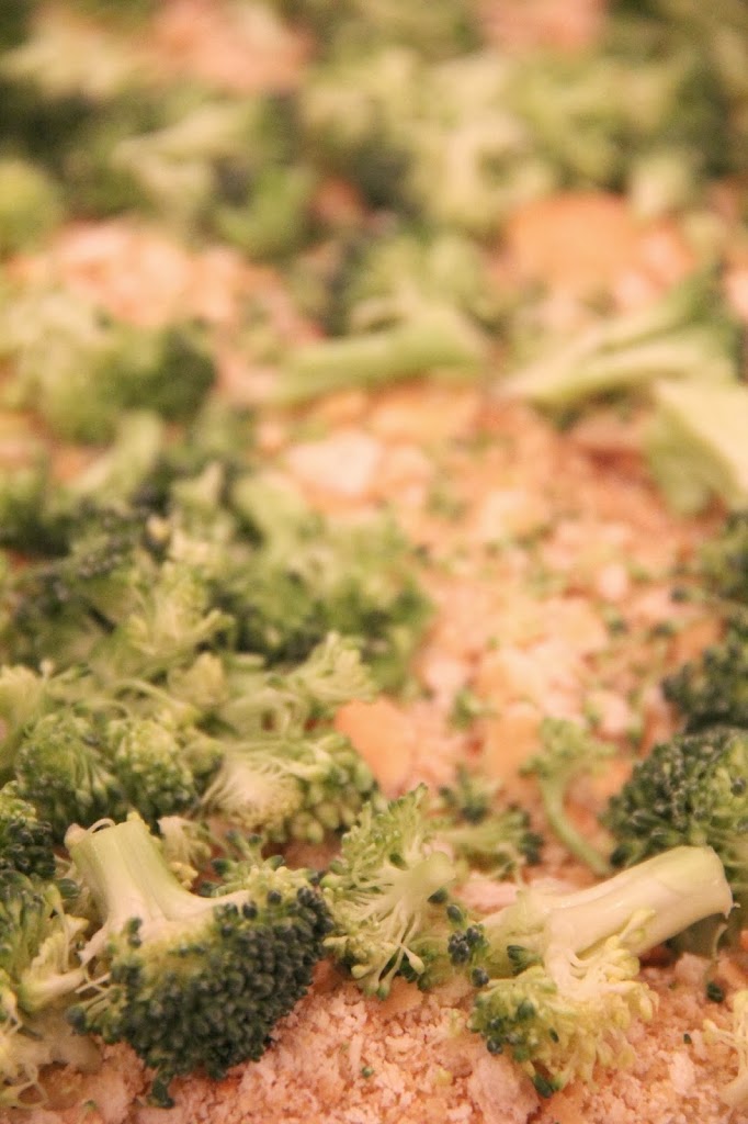 Isn't this the easiest recipe ever? Here comes the fun part. Throw on your crushed crackers, spreading them evenly over the chicken breasts and top the crackers with the broccoli florets.