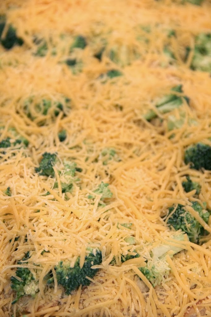 - Pour soup over the chicken, and sprinkle the following on top – ritz crackers, broccoli, and cheddar cheese
