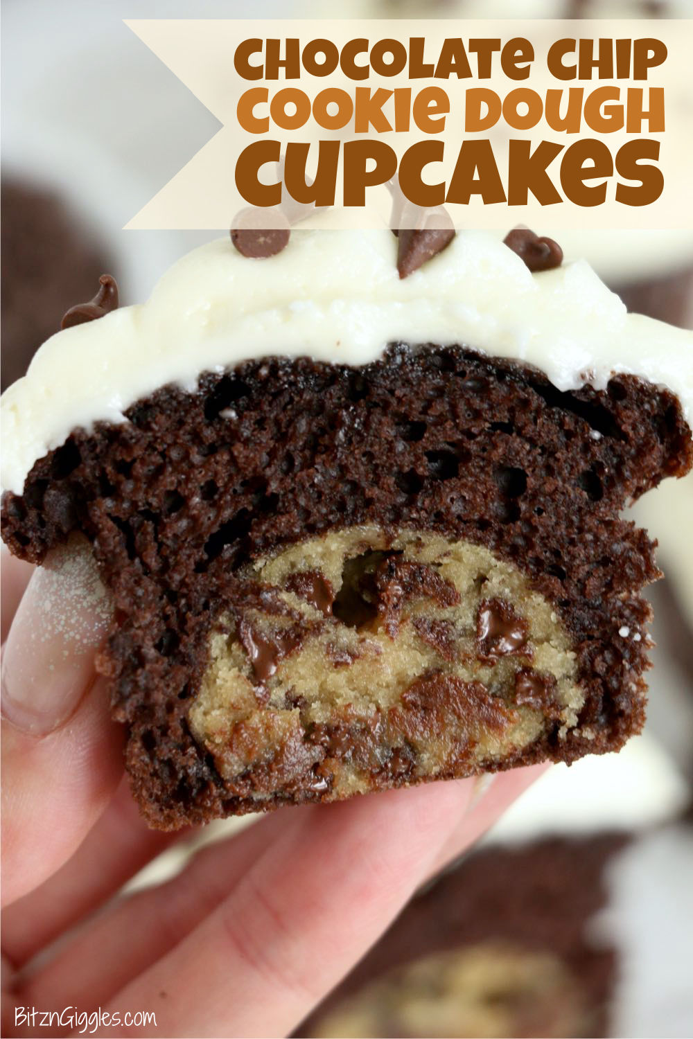 Chocolate Chip Cookie Dough Cupcakes - Rich chocolate cupcakes filled with a decadent chocolate chip cookie dough center! Delicious and super easy to make!