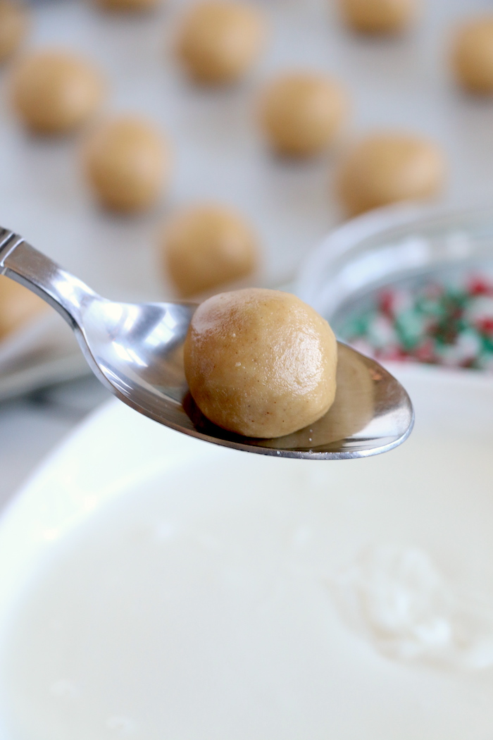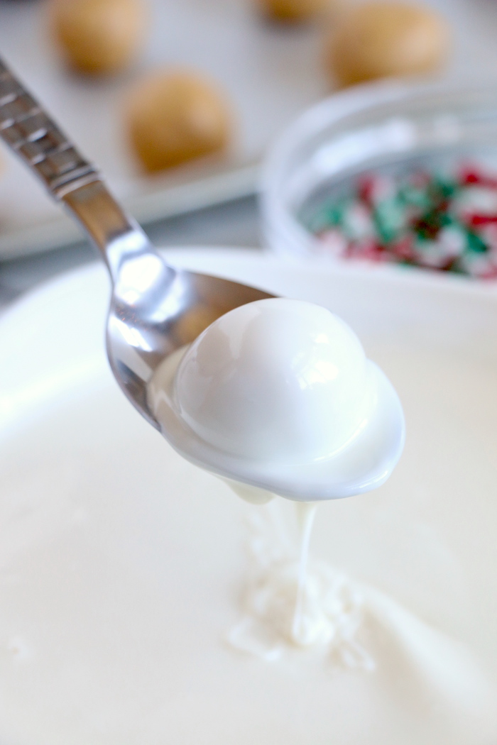 When the balls are ready, use a spoon to dip them into the melted almond bark. If you would rather use a darker chocolate, eight ounces of chopped semi-sweet chocolate or chocolate chips would be a good substitute!