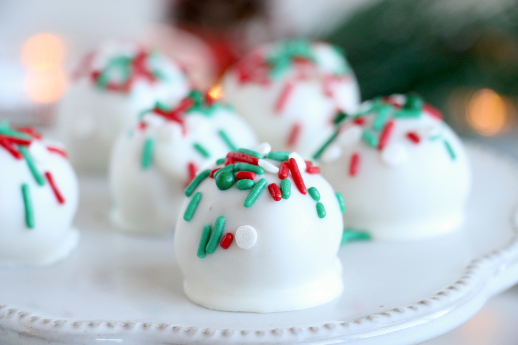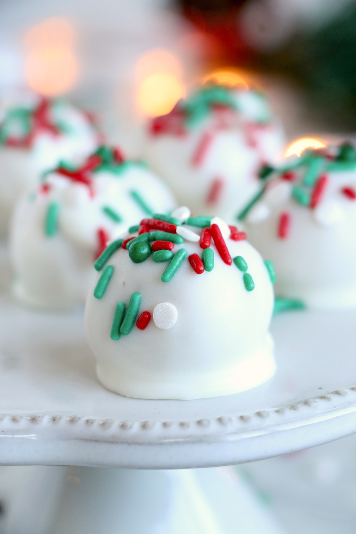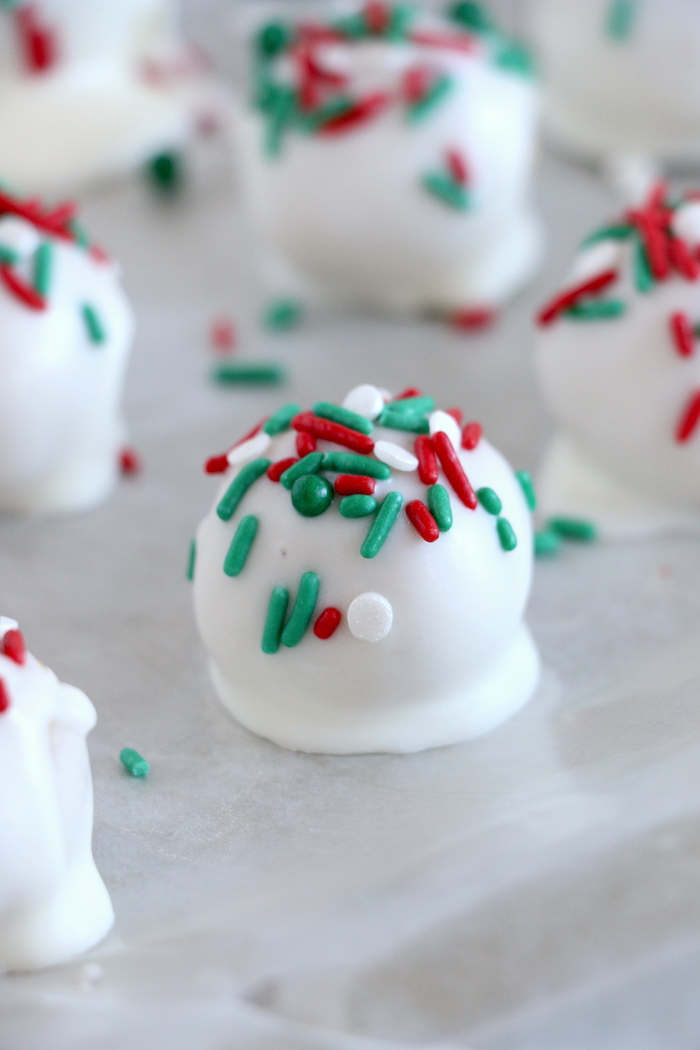 Place the dipped balls onto a cookie sheet covered with waxed paper, add some sprinkles and let them set.