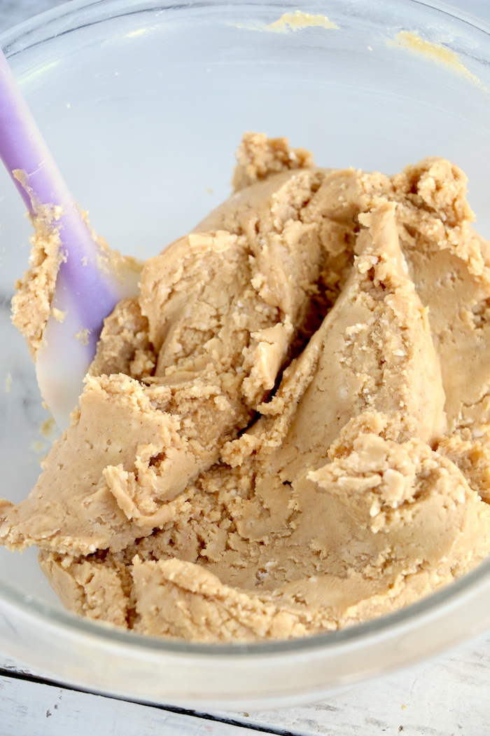 Start by combining your sugar, peanut butter and butter in a medium-sized mixing bowl.