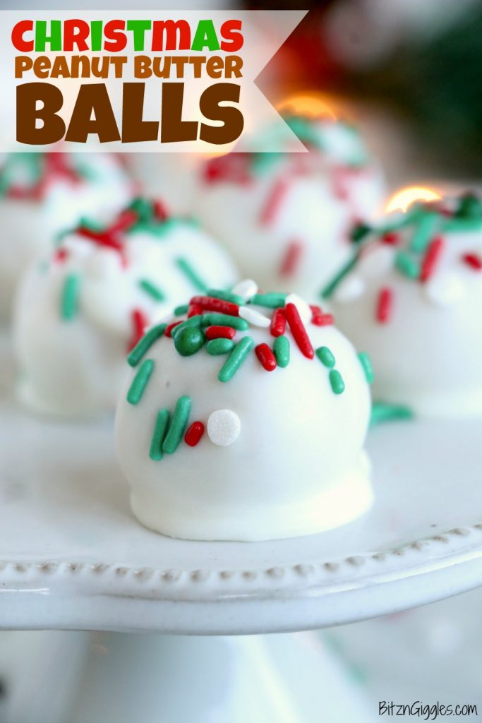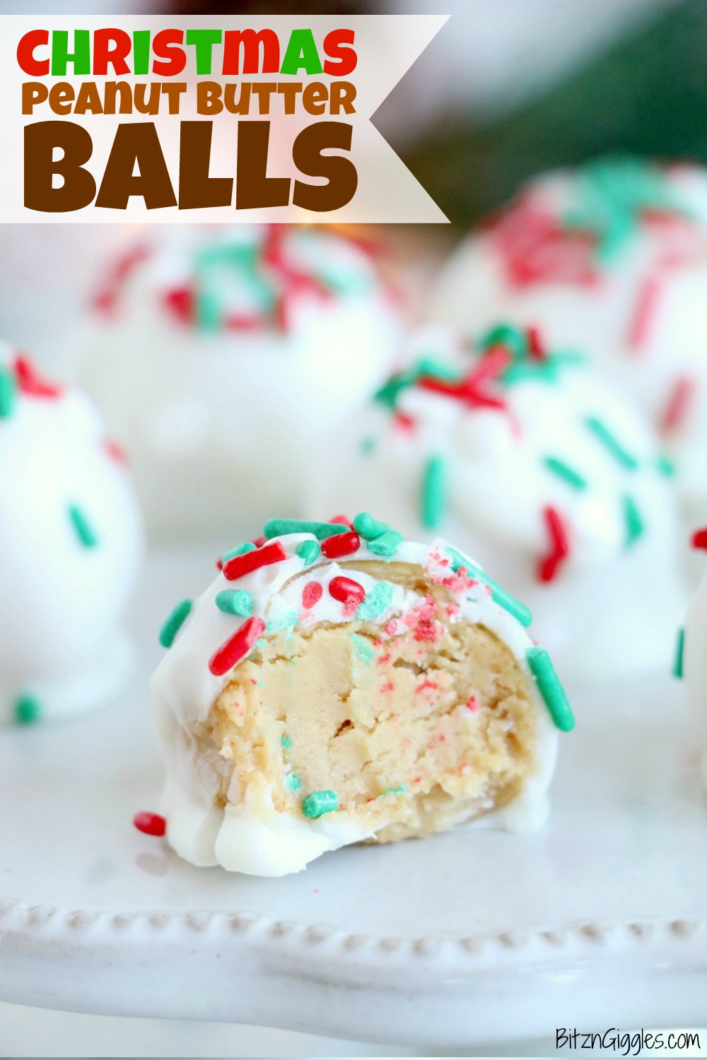 Christmas Peanut Butter Balls - Scoops of creamy peanut butter, rolled into balls, dipped in white chocolate and covered with sprinkles for the holidays!!