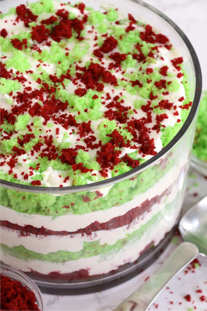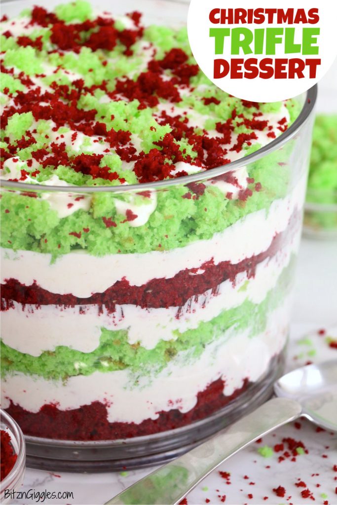 Christmas Trifle Dessert is a festive Christmas layer dessert made with crumbles of white and red velvet cake and a sweet creamy filling! Perfect for holiday gatherings, a Christmas trifle can be easily customized to suit different tastes.