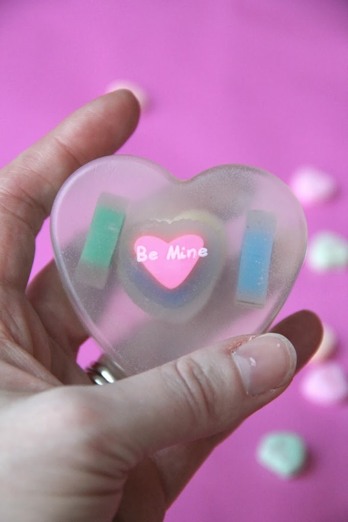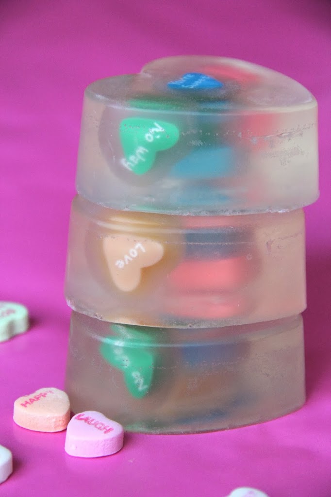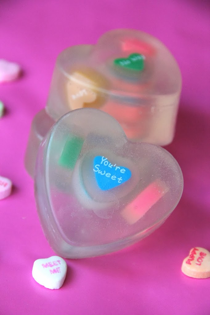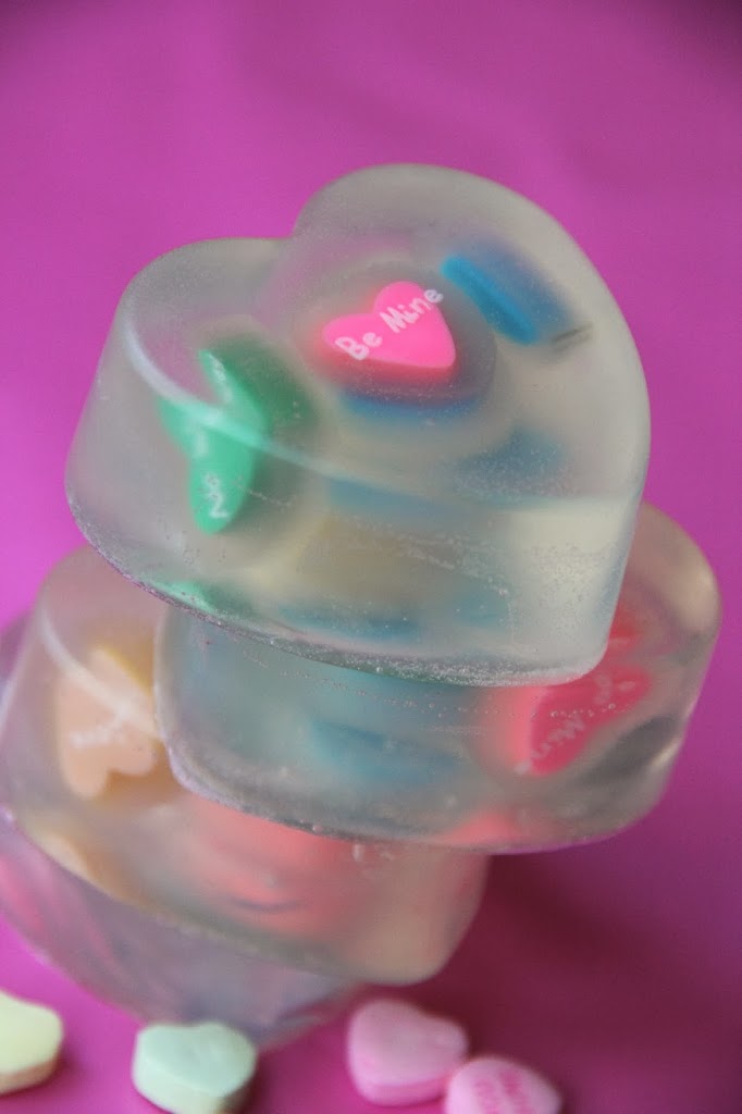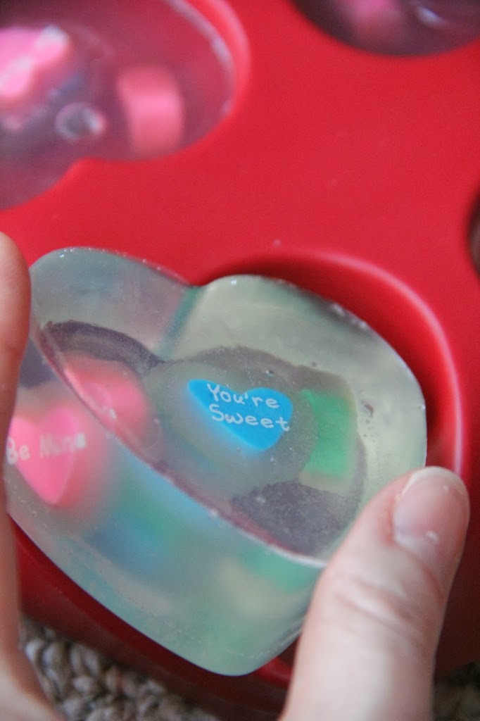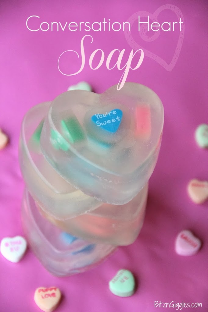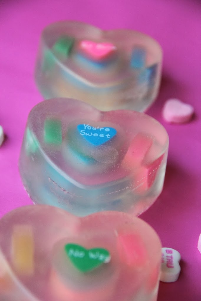 Love the soap idea... for some reason can't get my soap right. Cut out lots of felt hearts, wrote conversation heart words on with paint pen, dipped in soap to make small conversation heart soaps (saw in Martha Stewart) Don't know what I'm doing wrong but I just get lumpy soap, and when I try pouring into forms soap isn't clear....I give!