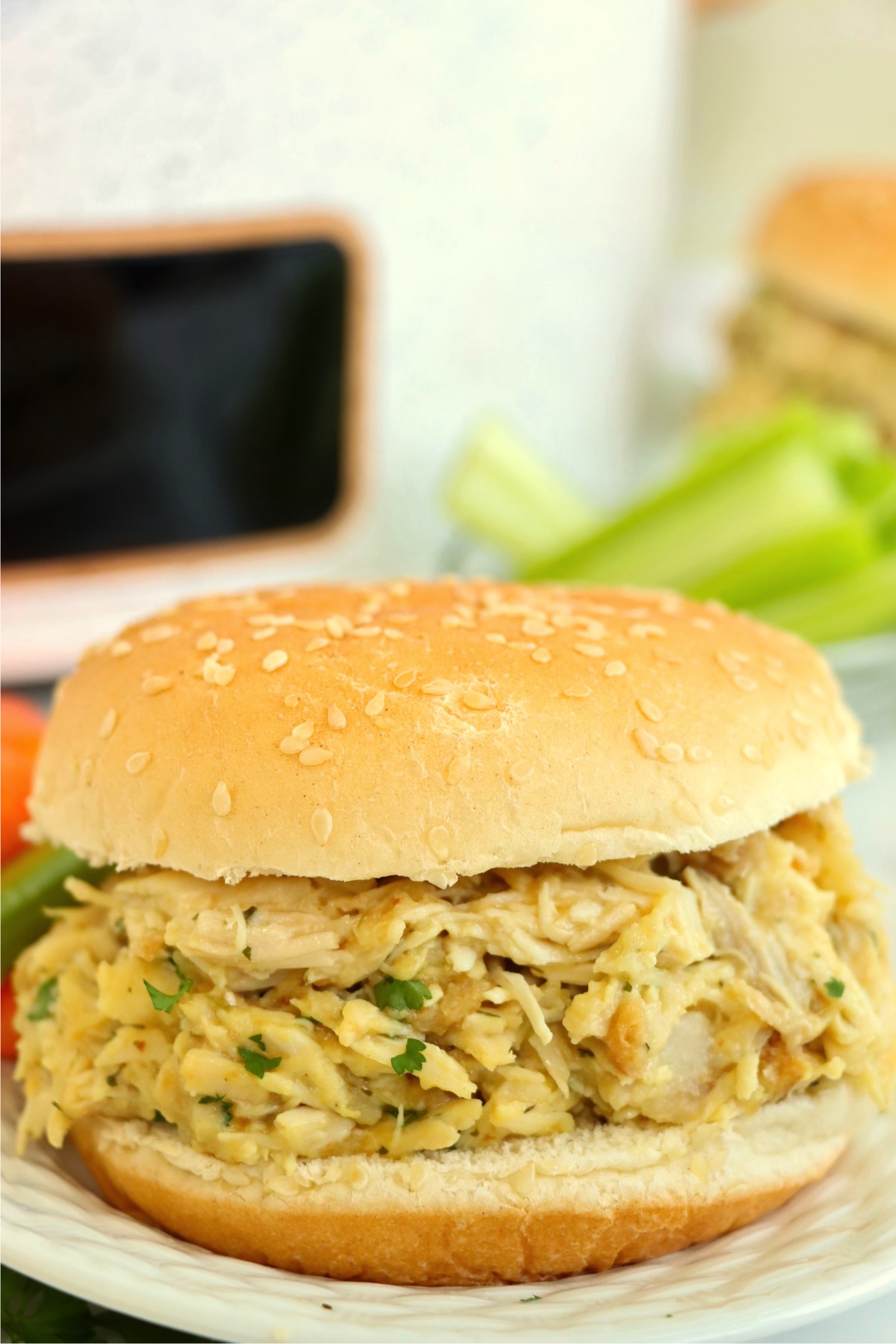 Making this chicken in a slow cooker gives you the time to do other things while the crock pot does all of the work! Whether you use it for sandwiches, or serve it on top of some warm mashed potatoes, this creamy chicken is the perfect addition to any dish!