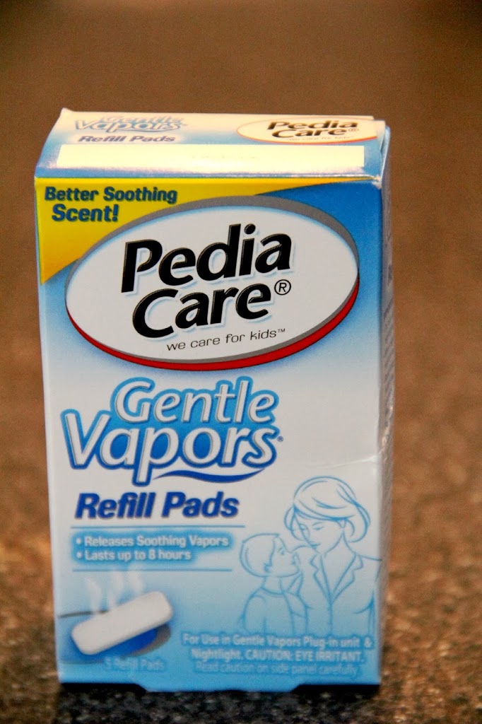 It's cold and flu season. Thankfully everyone in my house is healthy right now. I hope I didn't just jinx anything. When the kids do have head colds I break out my arsenal of humidifiers, tissues, Clorox wipes, chicken soup and these Pedia Care Gentle Vapor pads. Pedia Care makes a unit that plugs into the wall that heats the little pads and releases the vapors into the air to help children breathe at night when they're fighting a cold. They kind of smell like Vicks Vapor Rub and last well into the morning. I really love to use them, but they're pretty expensive.