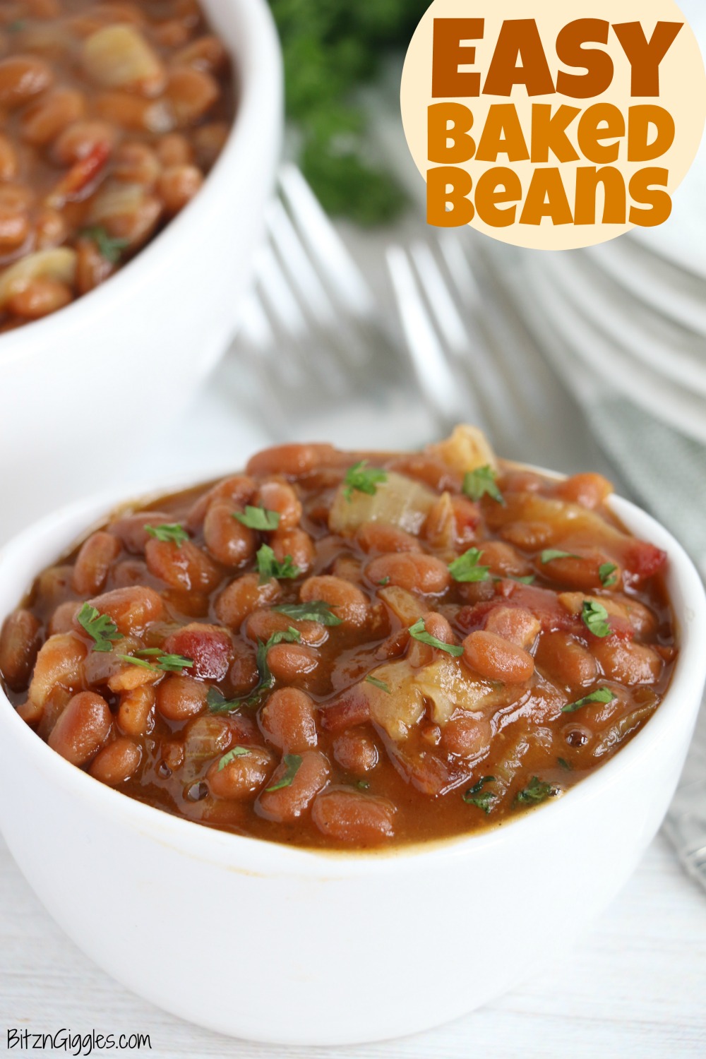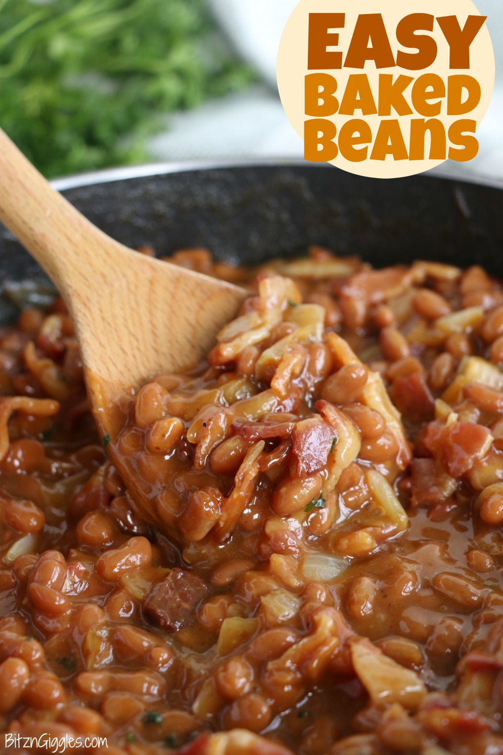 Bake for 1 hour or until the sauce is nicely thickened. I like to garnish the baked beans with a little fresh parsley to add some color, but that is completely optional!