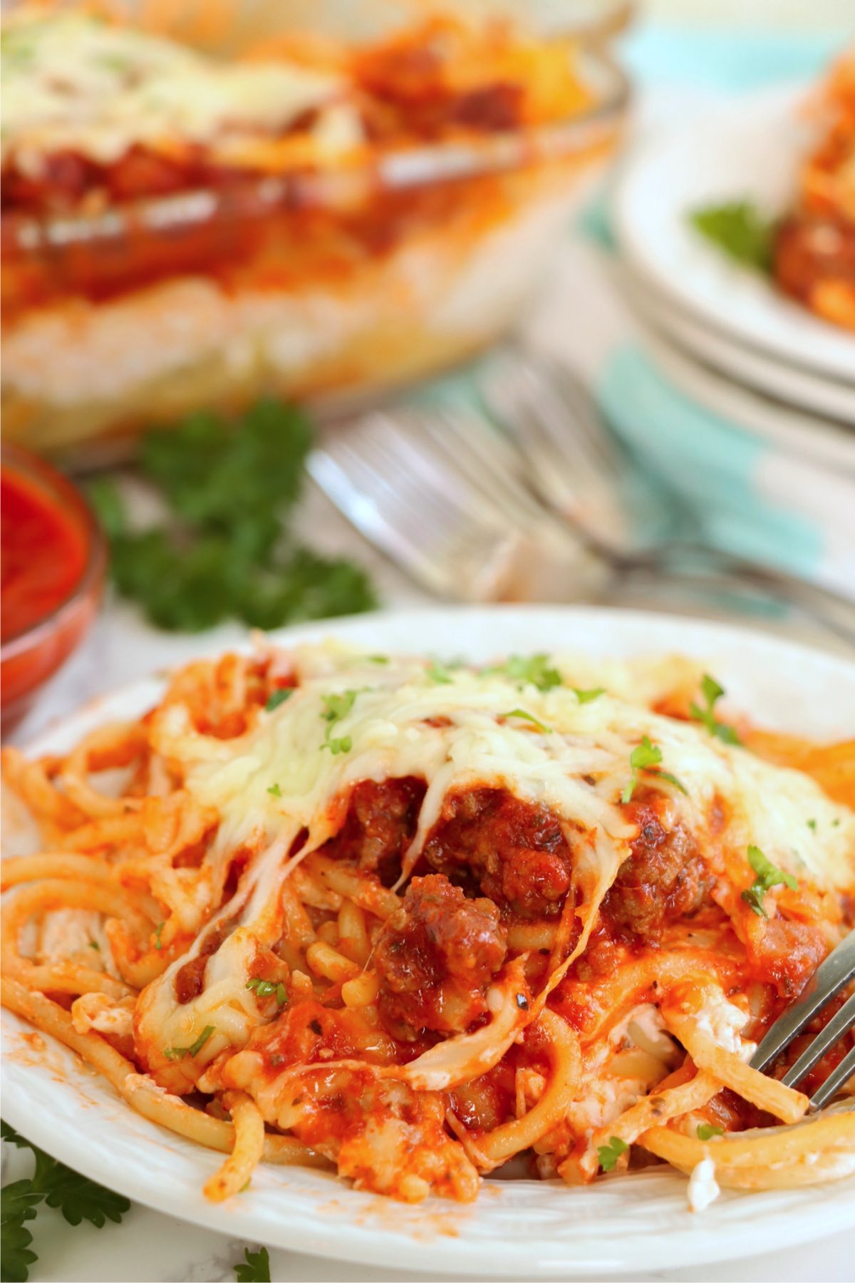 - Spaghetti noodles are the perfect base for this dish. They hold the flavors of the meat sauce and cheese blend and make sure that every bite is full of flavor.