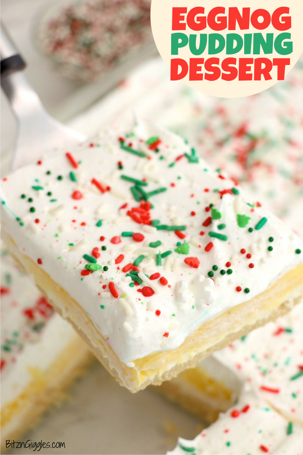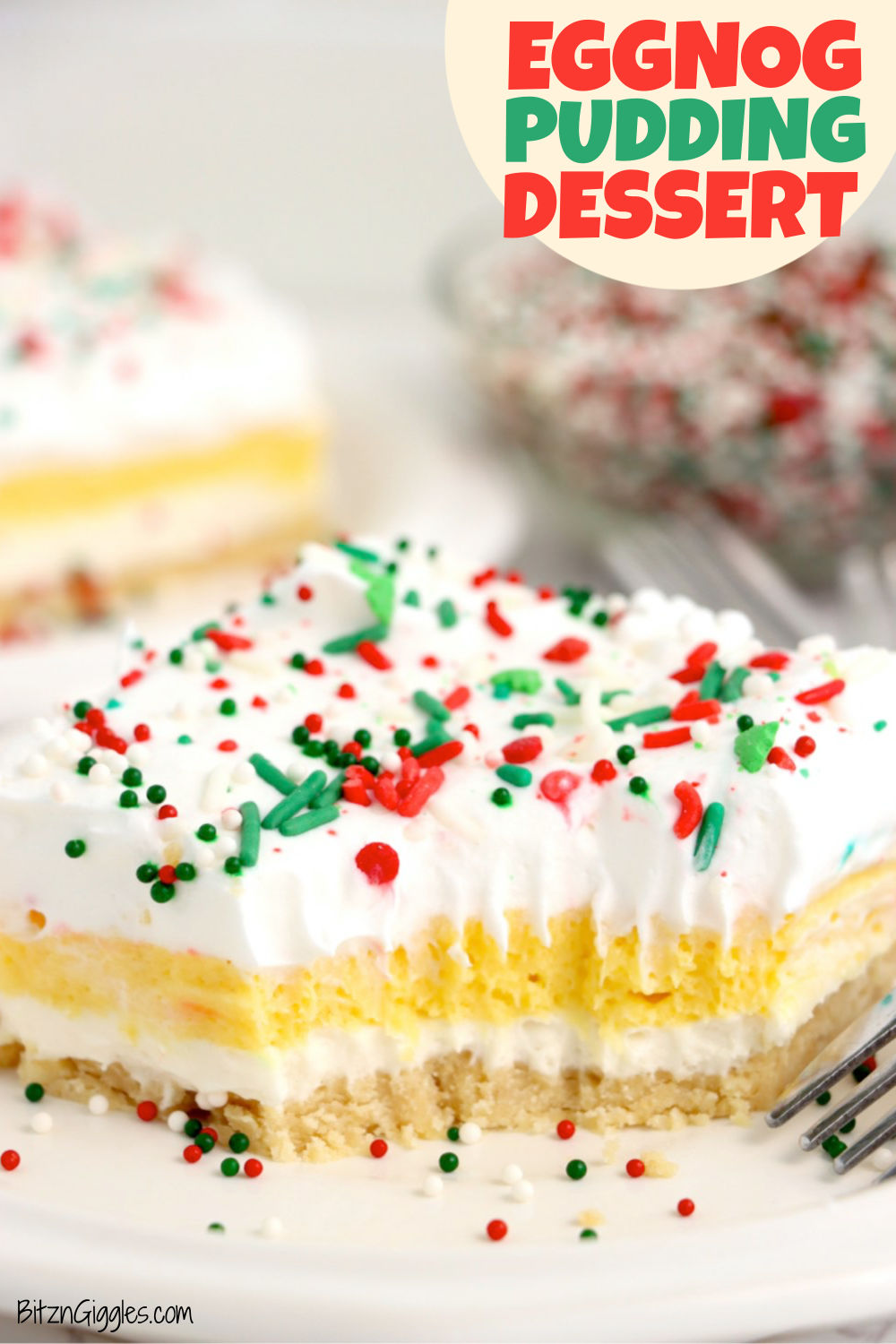 Eggnog Pudding Dessert - A triple-layer, no-bake dessert featuring sweetened whipped cream cheese, creamy eggnog pudding, and fluffy whipped topping with festive sprinkles on top of a vanilla cookie crust. The perfect Christmas treat!
