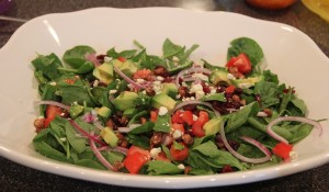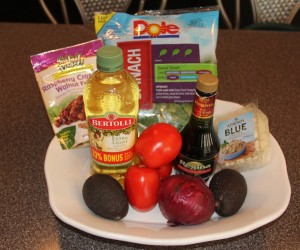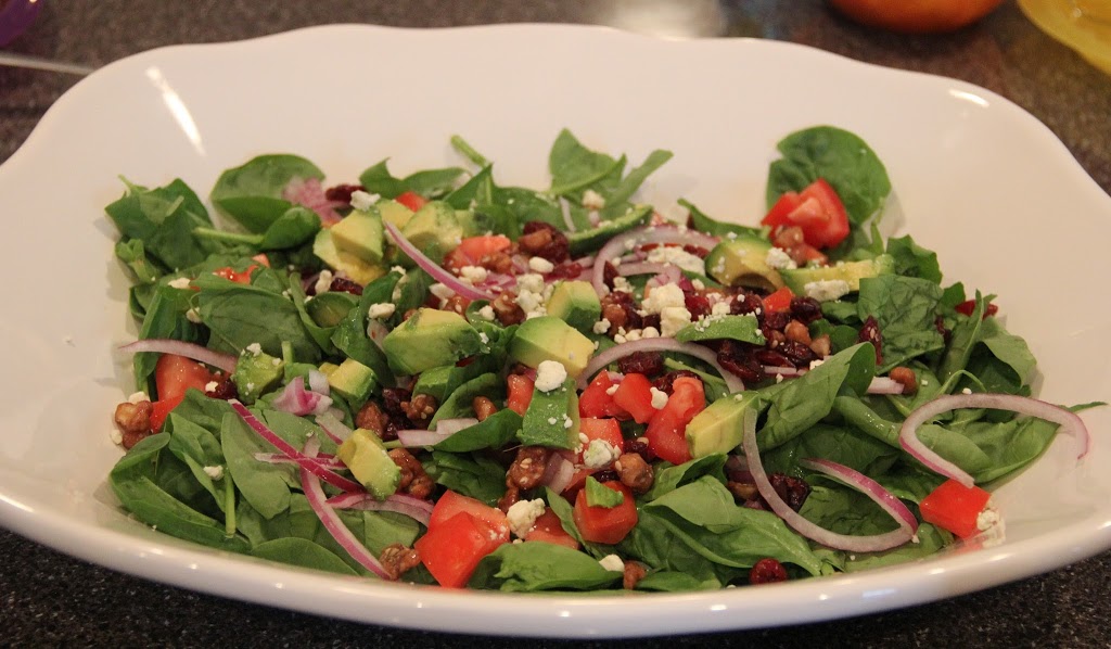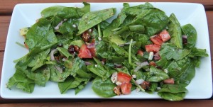 Add your tomatoes and onions to the spinach and throw in an avocado or two (peeled, pitted and diced). Now sprinkle in 1 cup Salad Pizazz -Raspberry Cranberry Walnut Frisco (Or you can use ½ cup toasted chopped walnuts and ½ cup dried cranberries). Toss gently and sprinkle on some blue cheese crumbles.