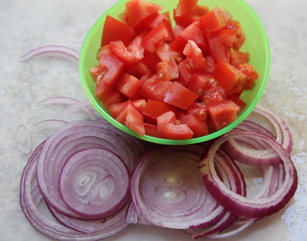 Start by dicing up your tomatoes (I used 3) and slicing up about ½ red onion.