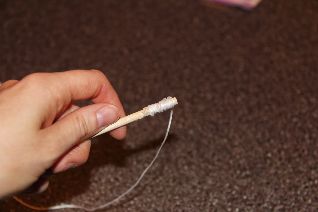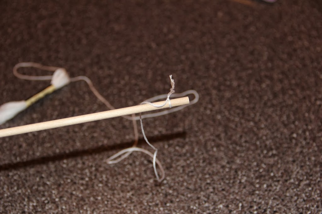 Now, it's time to start putting the fishing poles together. Grab one of the wooden dowels and string. Tie a piece of the string around the top of the dowel.