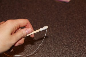 Get your glue gun and run a strip of glue over the knot you tied and down the top of the dowel. Now, start wrapping the string around the end of the dowel.
