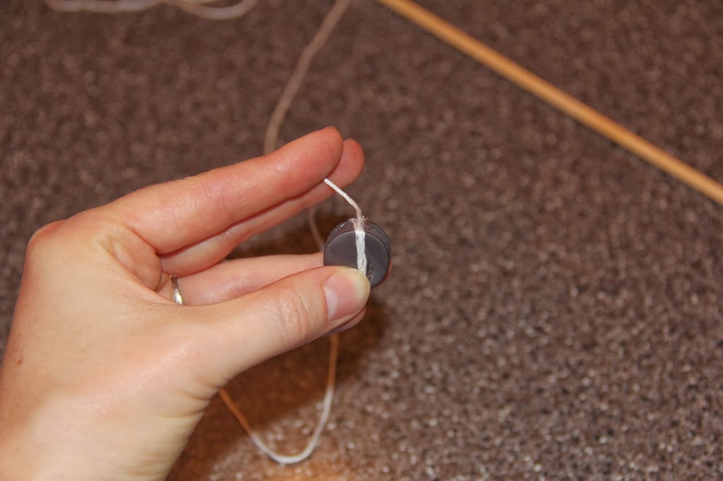 - Decide on how long you want your "fishing line" and cut the string. Take one or two of the magnets (I used two magnets back to back), place a line of glue across the magnets and start wrapping the string around the magnet, securing well with the glue gun.
