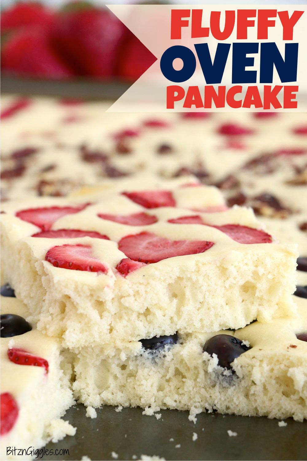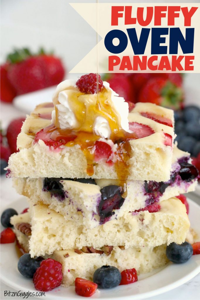 Fluffy Oven Pancake - Fluffy and soft sheet cake pancake, perfect for serving a crowd! Topped with maple syrup, your choice of fresh berries and whipped topping, this recipe is sure to become a family favorite!