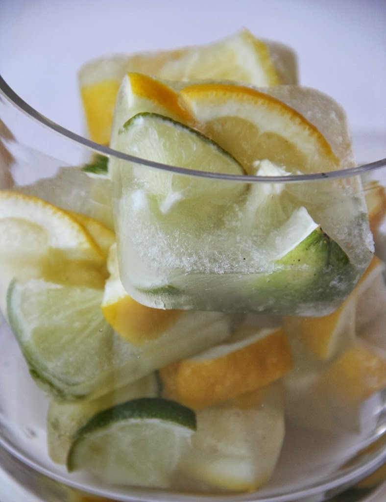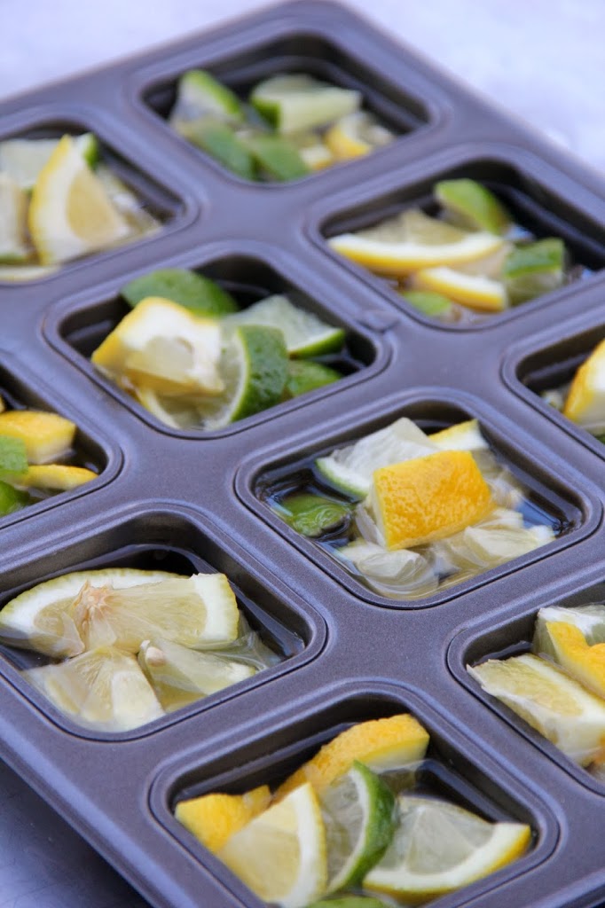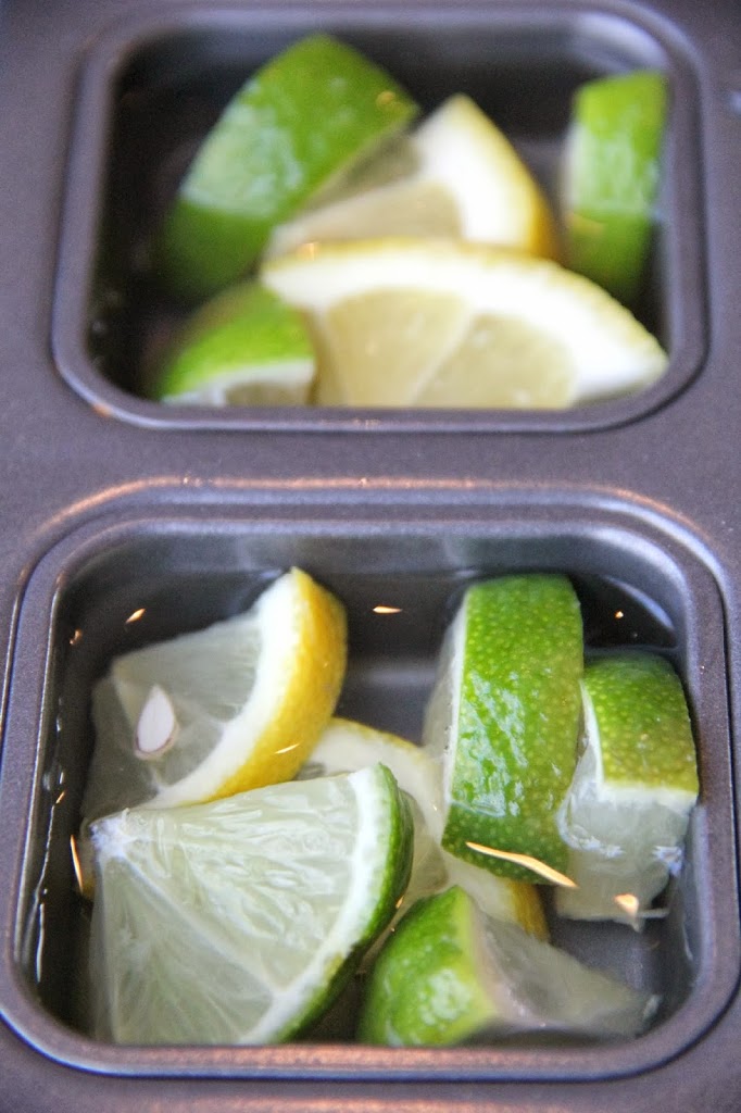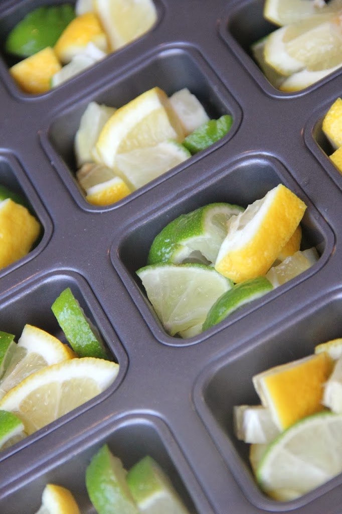 All you need to do is grab a muffin or brownie pan. If you don't have either of those, just use an ice cube tray. Slice up some lemons and limes and place a few in each of the cups.