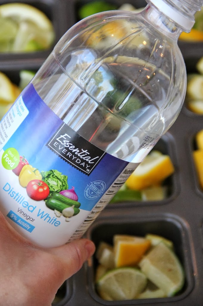Fill each cup up almost to the top. Are you having fun yet? I sure am. These tablets are so easy to make, and I love the smell of lemons and limes. You could even use orange peels if you'd prefer. Heck, along with the fruit put in a few drops of lemon or orange essential oil for each of the tablets!