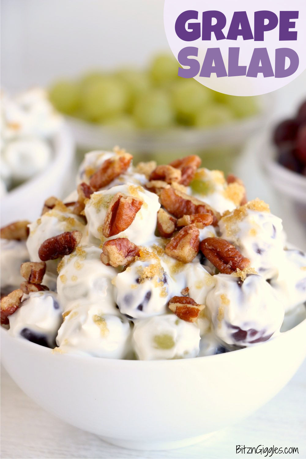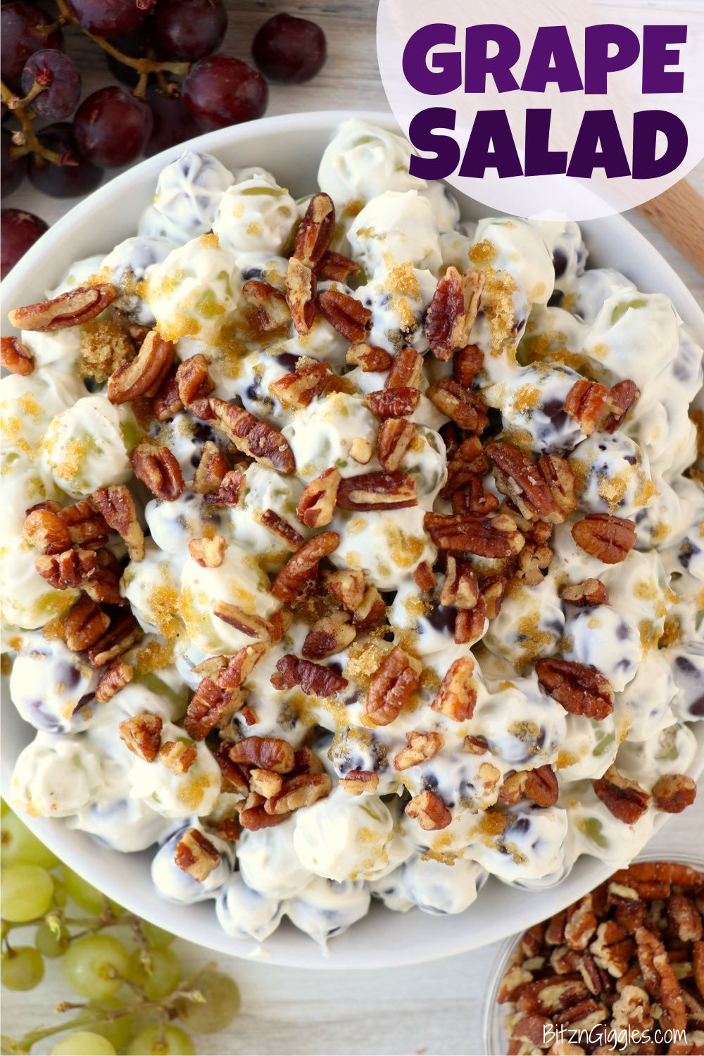 Grape salad is made with red and green grapes that are mixed with a sweet cream cheese dressing. Then it's topped with chopped, toasted pecans and brown sugar! It's SO good and super simple to prepare!