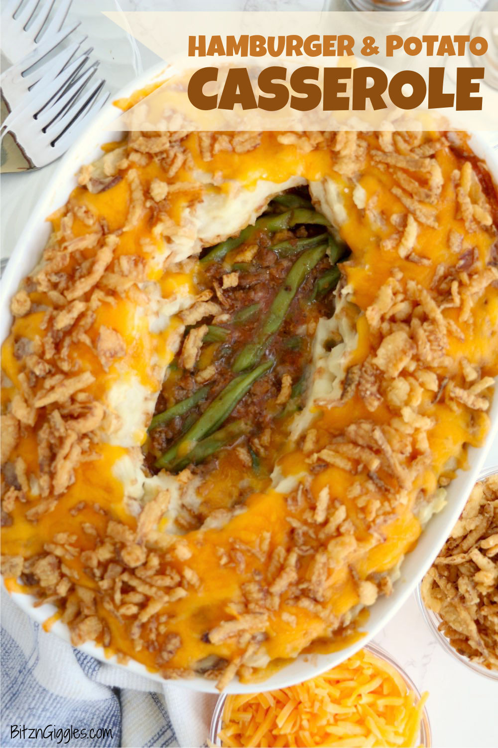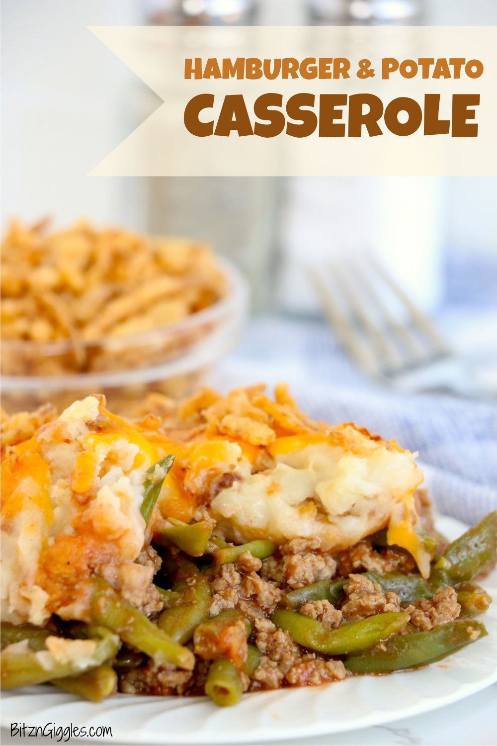 Hamburger and Potato Casserole - A nostalgic and hearty Midwestern casserole featuring ground beef and green beans, surrounded by cheesy mashed potatoes and crunchy French fried onions.