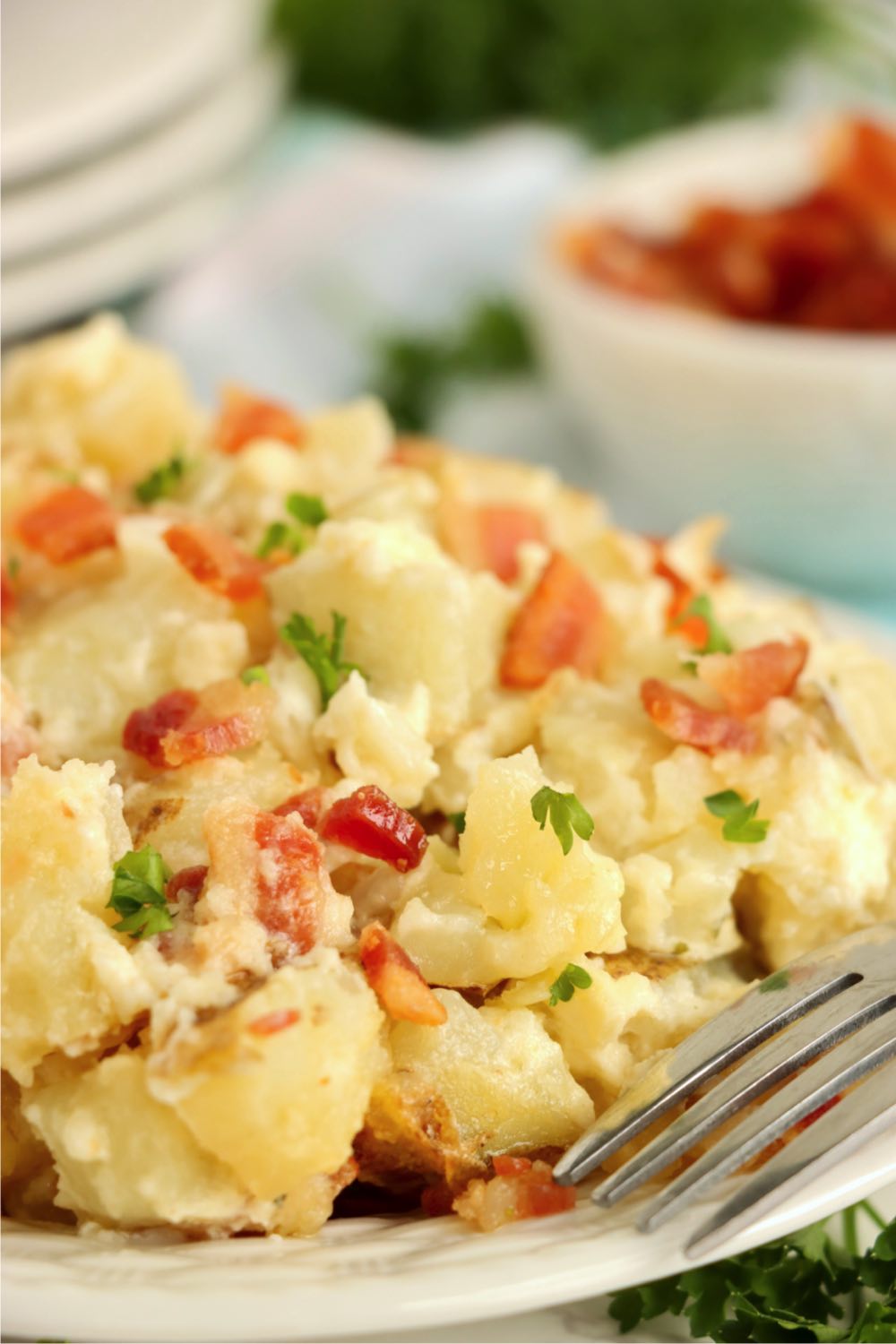 Loaded Baked Potato Casserole - Indulge in the ultimate comfort food with this simple and delicious creamy casserole, loaded with crispy bacon, chopped onion and irresistible ranch flavor!