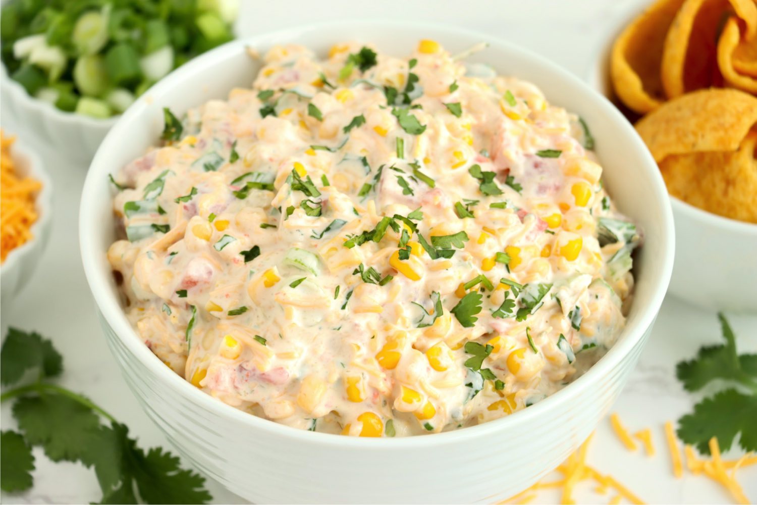 This delicious Mexicorn Dip recipe only requires a few ingredients and is absolutely addictive! It’s a savory corn dip with Mexicorn, Rotel, shredded cheese, green onions, mayonnaise, sour cream, and cilantro that goes great with a variety of crackers and chips.