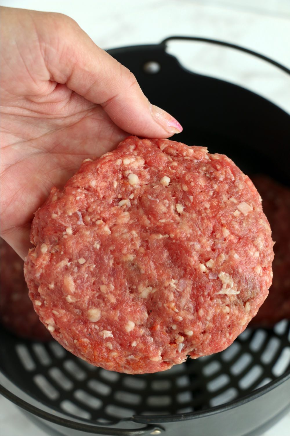 - Form 3-4 patties and place them in your greased air fryer basket (patties will shrink in size but get thicker. Be sure to flatten them before cooking to achieve the perfectly shaped burger).