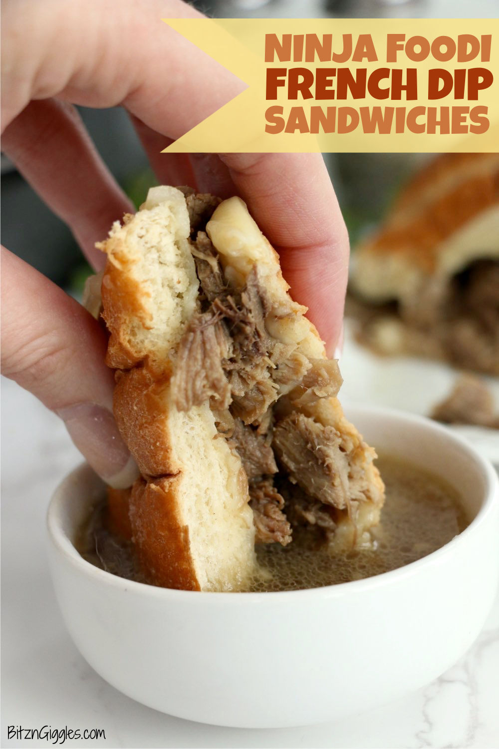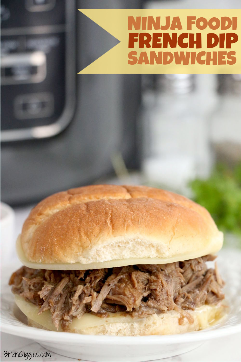 Ninja Foodi French Dip Sandwiches - Flavorful, tender beef and melted cheese served on a browned kaiser roll - ready in just an hour in the Ninja Foodi.