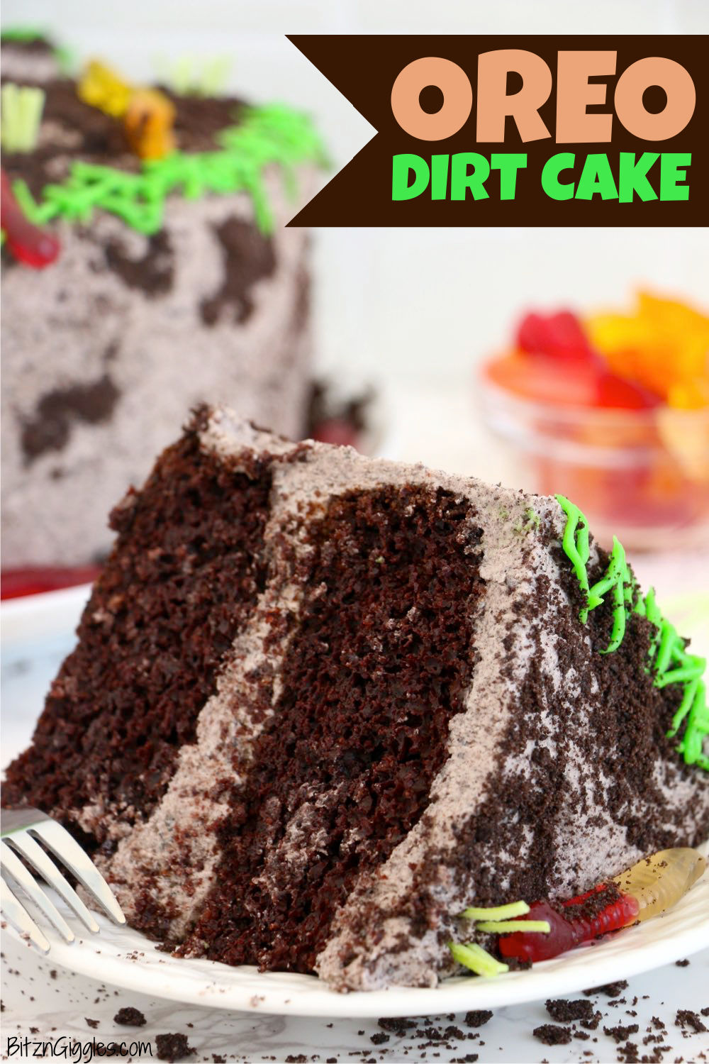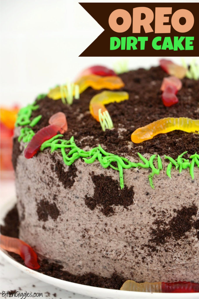 It's a decadent chocolate cake, layered with creamy whipped Oreo frosting and topped with gummy worms and edible Easter grass! It truly is the ultimate springtime dessert!