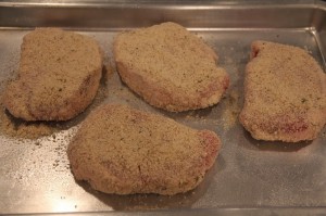 - Dip pork chops in milk and then coat with the crumb mixture.