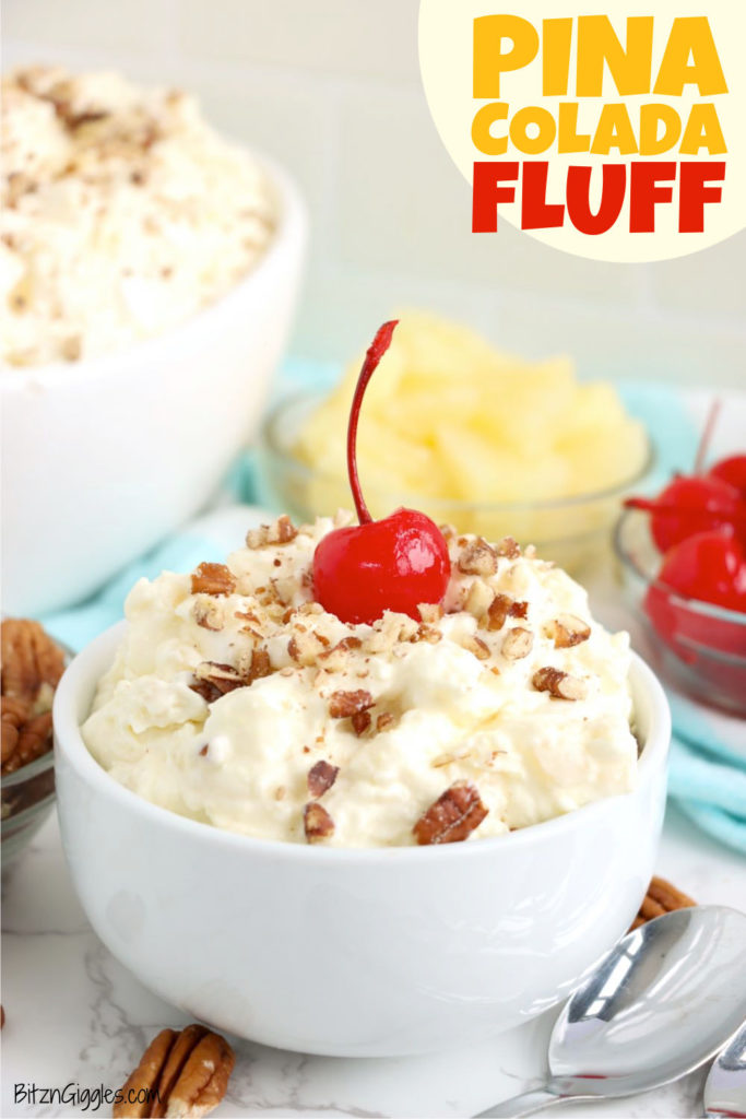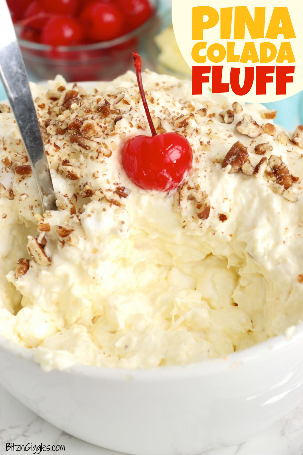 Pina Colada Fluff - Sweet crushed pineapple, fluffy whipped topping, smooth vanilla pudding, mini marshmallows, and chopped pecans come together to make the perfect summertime salad.