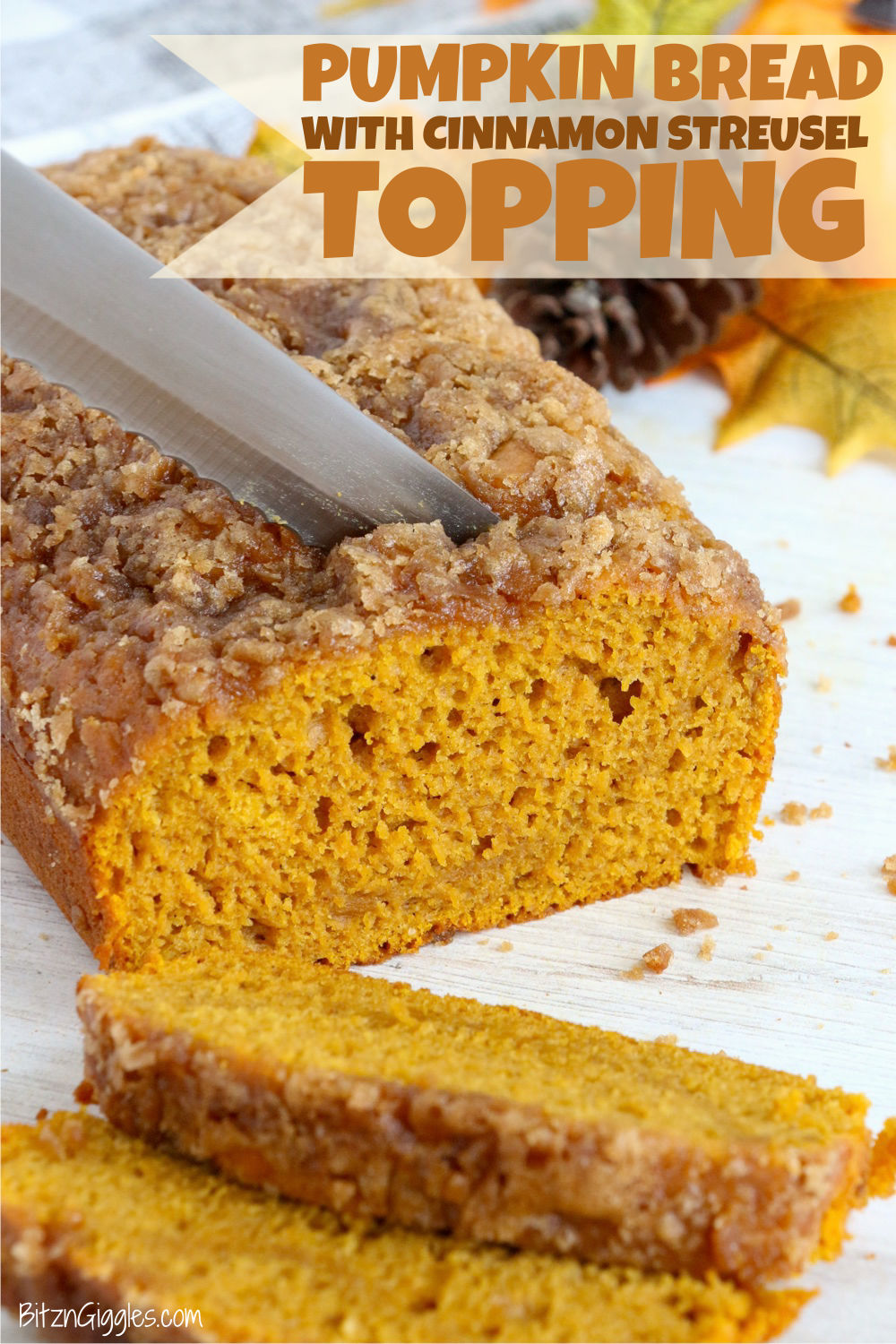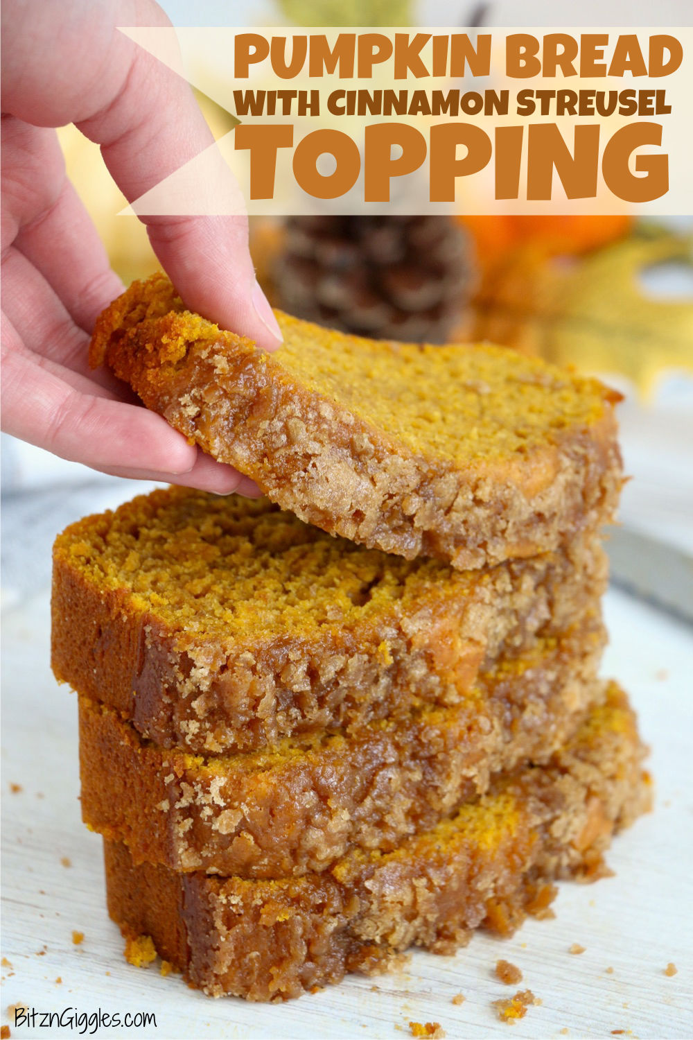 Do you enjoy the taste of freshly baked sweet bread in the fall? Two of my favorites are Chocolate Chip Banana Bread and this Pumpkin Bread with Cinnamon Streusel Topping.