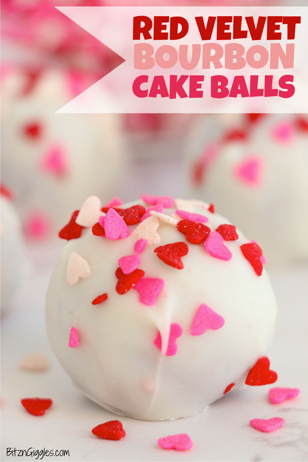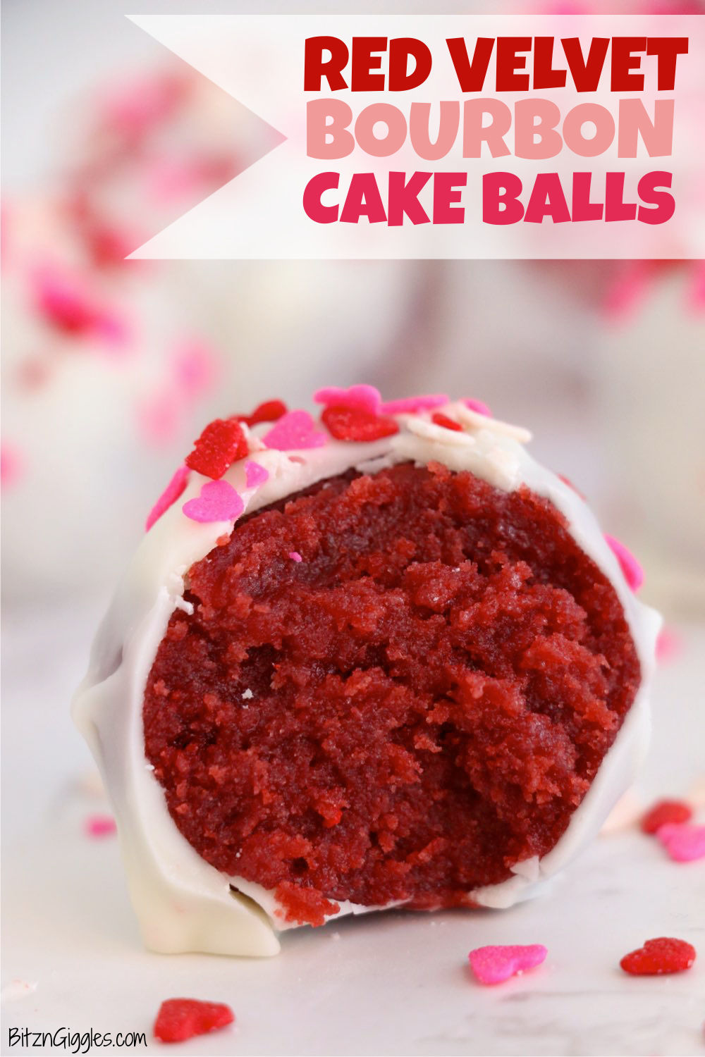Red Velvet Bourbon Cake Balls - Red velvet cake balls spiked with bourbon, dipped in white chocolate and decorated with sprinkles. Makes a delicious and festive Valentine’s Day dessert.
