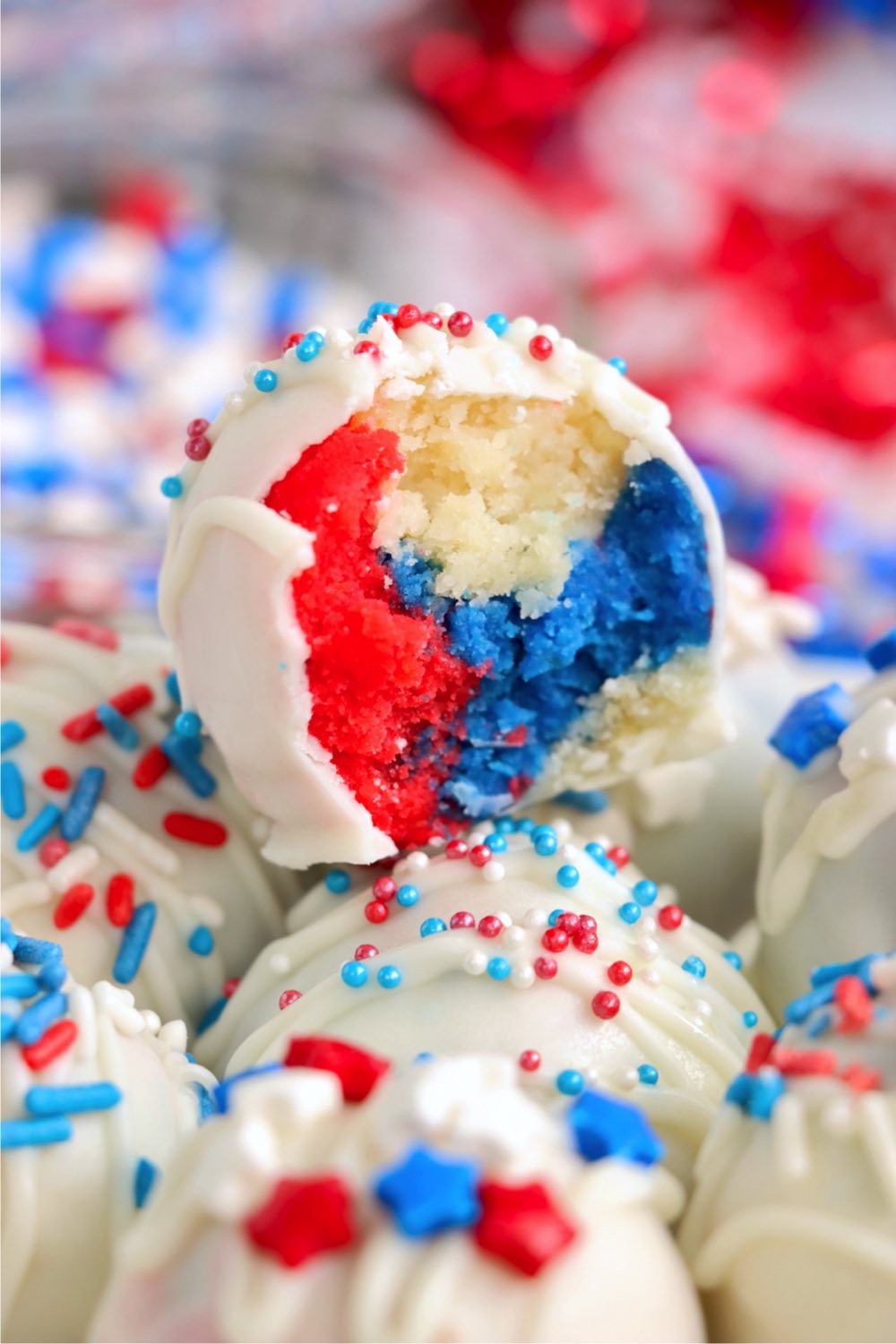 The deliciously sweet and soft white cake is colored red and blue, mixed together into bite-sized cake balls and then dipped in melted white almond dark and topped in patriotic sprinkles!
