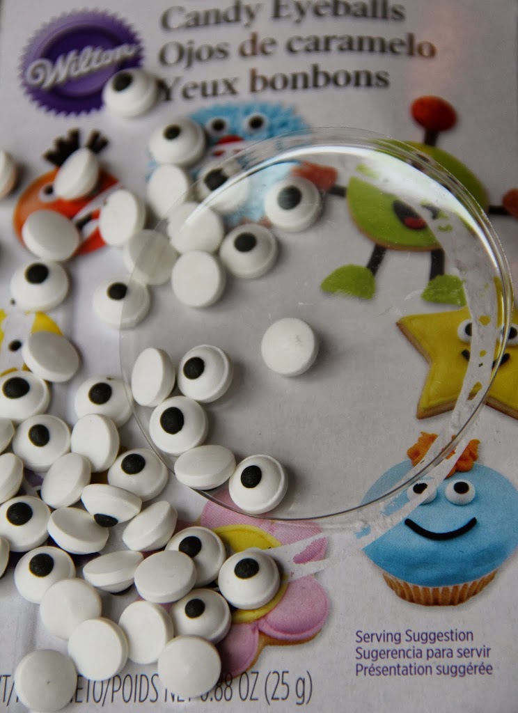 Now put a little of the frosting on the back of each of the eyeballs and stick them on the front of the peanut butter cup.