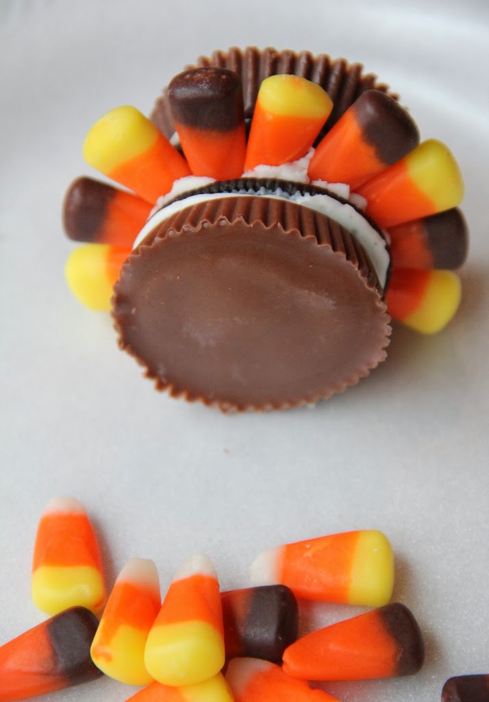 For each turkey you'll need: one Mega Stuff Oreo, two Reese's PB cups, 10 pieces of candy corn, two candy eyeballs and some frosting for the "glue." I just used the frosting in a jar you can buy from the baking aisle in the grocery store.