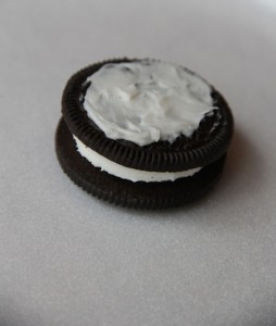 - The first thing you want to do is take your Oreo and put some frosting on one of the sides.