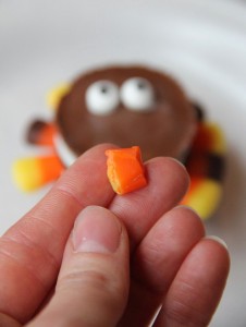 - Now take your final piece of candy corn and chop off the top and bottom so you're left with a little piece.