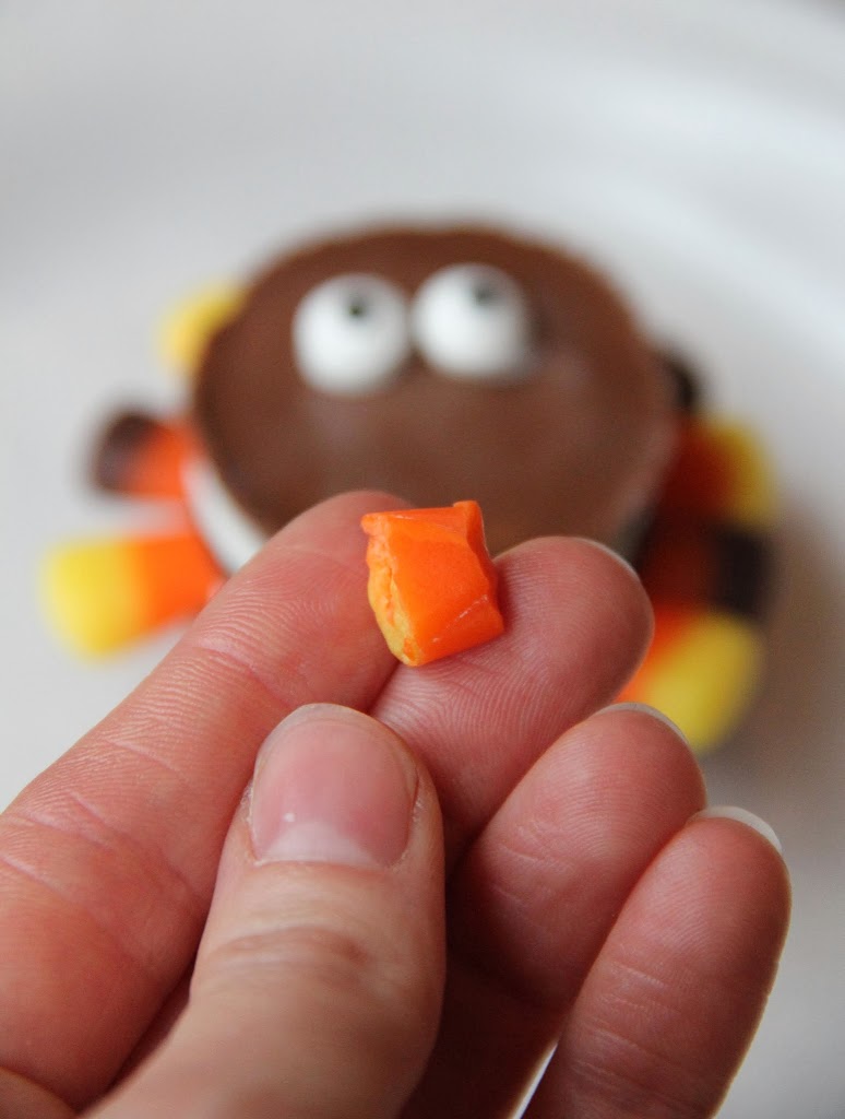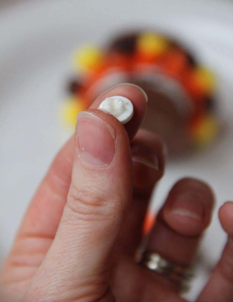 And there you have it, a sweet, silly turkey treat. And yes, I know you can see some of the frosting seeping out from behind his eyes. Yes, chocolate frosting would have been better! But you know what? It's ok. When I showed these treats to the kids they were through-the-roof excited. It didn't matter the turkey had a little eye goo. They didn't even notice.