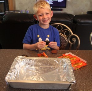 Unwrap candy from 2 of the Reese's packages. You're basically unwrapping 24 cups. Dane is showing you his Reese's Cups. He did awesome with all of the unwrapping. And I was so proud of him. He didn't ask to eat even one of them. . .yet.