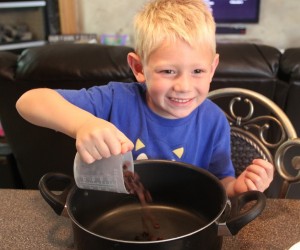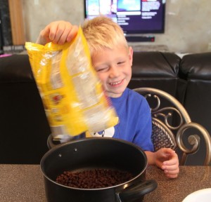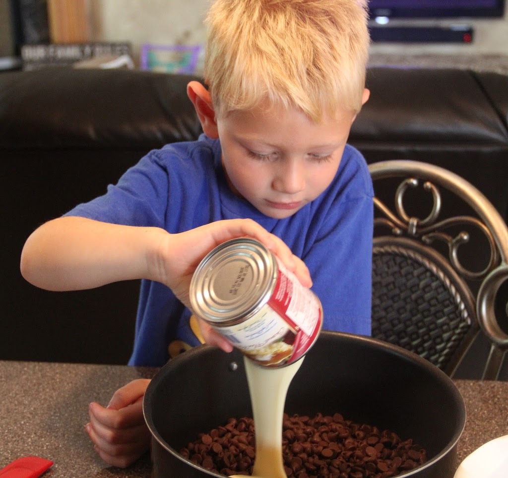 Many of the recipes call for a 9x9 inch pan, some of them add marshmallows and yet others substitute brownies for the fudge. Today we're making a big 9x13 inch pan of these yummy fudge bars because it's a potluck and we're going to have lots of mouths to feed. I've enlisted my son, Dane, to help. He was more than willing, believe me. His sister was napping, so he knew the spatulas, bowls and candy were all his.