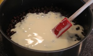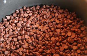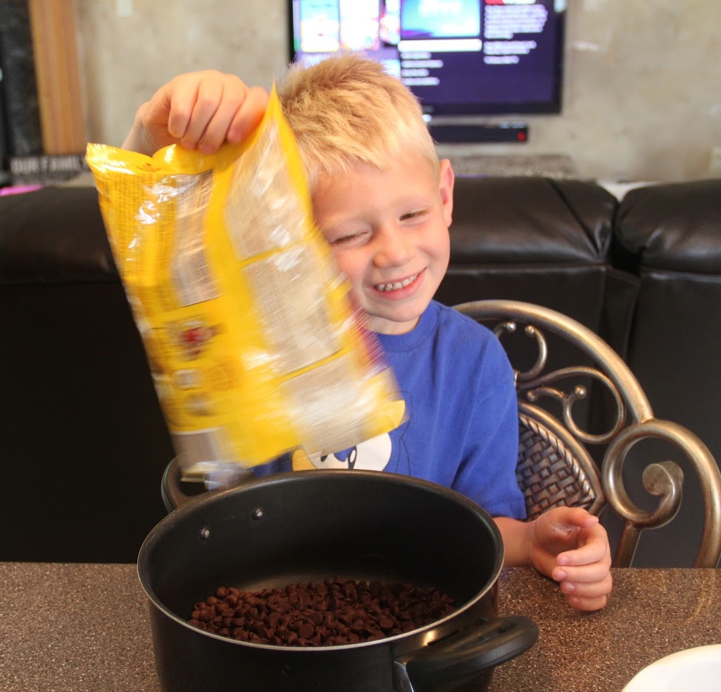 Next start pouring the chocolate chips into a pan. We started with 3 cups. . .