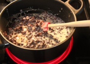 This is the fun part. Pour one can of sweetened condensed milk into the bowl with the chocolate chips. I added about ½ of another can. I was tempted to add the rest of the second can, but I held myself back because I wasn't sure if it would set.