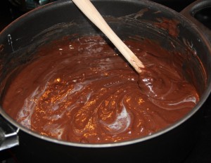 Put the pan on the stove and start melting this mixture together, stirring often. Have you ever burned chocolate? Yep, you know what I'm talking about. It's a terrible, terrible thing and it will ruin your entire day so just try not to get distracted and keep stirring.